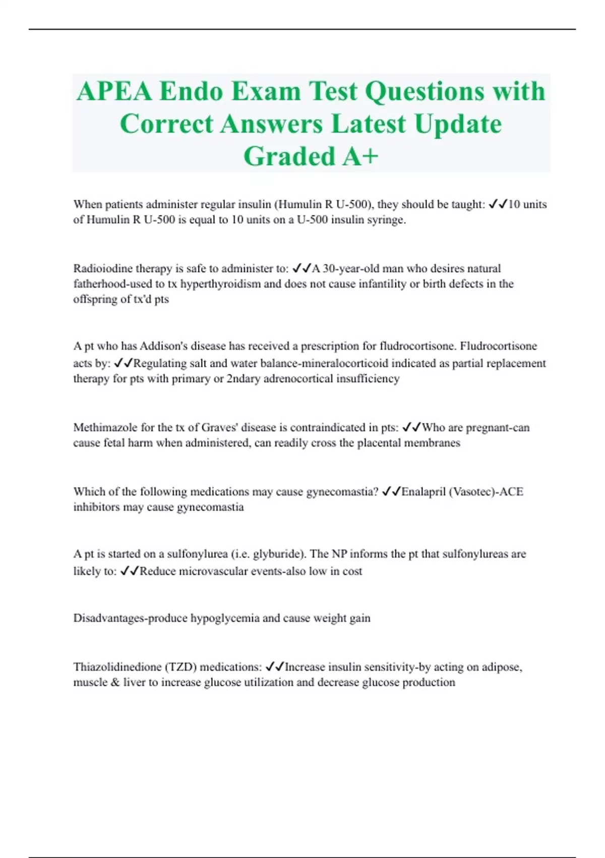 APEA Endo Exam Test Questions with Correct Answers Latest Update Graded A+ When patients administer regular insulin (Humulin R U-500), they should be taught: 10 units of Humulin R U-500 is equal to 10 units on a U-500 insulin syringe. Radioiodine therapy is safe to administer to: A 30-year-old man who desires natural fatherhood-used to tx hyperthyroidism and does not cause infantility or birth defects in the offspring of tx'd pts A pt who has Addison's disease has received a prescription for fludrocortisone. Fludrocortisone acts by: Regulating salt and water balance-mineralocorticoid indicated as partial replacement therapy for pts with primary or 2ndary adrenocortical insufficiency Methimazole for the tx of Graves' disease is contraindicated in pts: Who are pregnant-can cause fetal harm when administered, can readily cross the placental membranes Which of the following medications may cause gynecomastia? Enalapril (Vasotec)-ACE inhibitors may cause gynecomastia A pt is started on a sulfonylurea (i.e. glyburide). The NP informs the pt that sulfonylureas are likely to: Reduce microvascular events-also low in cost Disadvantages-produce hypoglycemia and cause weight gain Thiazolidinedione (TZD) medications: Increase insulin sensitivity-by acting on adipose, muscle & liver to increase glucose utilization and decrease glucose production