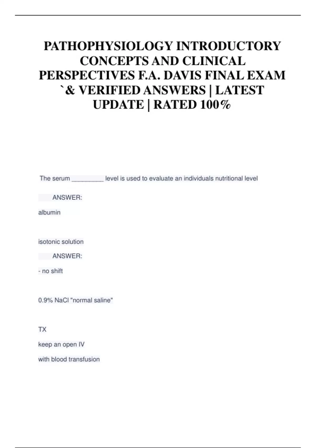 PATHOPHYSIOLOGY INTRODUCTORY CONCEPTS AND CLINICAL PERSPECTIVES F.A. DAVIS FINAL EXAM `& VERIFIED ANSWERS | LATEST UPDATE | RATED 100%