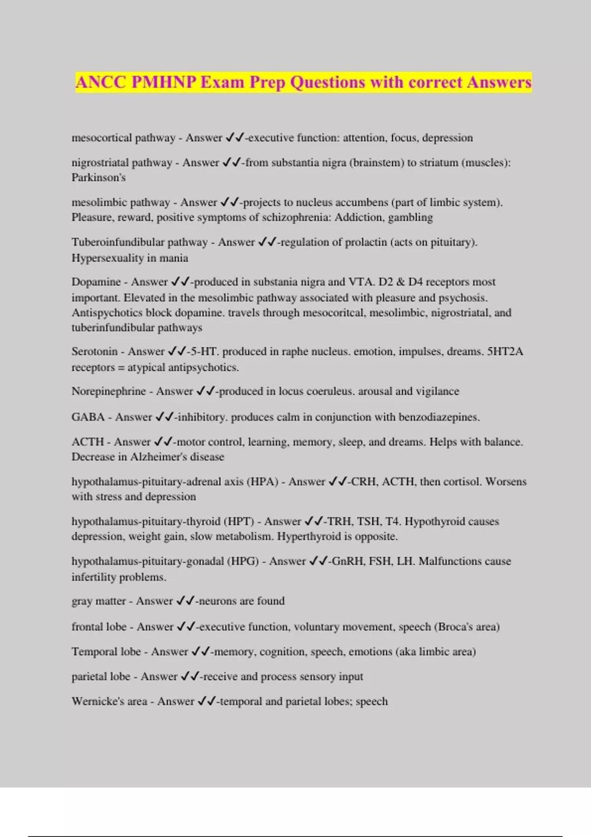 ANCC PMHNP Exam Prep Questions with correct Answers mesocortical pathway - Answer ️️ -executive function: attention, focus, depression nigrostriatal pathway - Answer ️️ -from substantia nigra (brainstem) to striatum (muscles): Parkinson's mesolimbic pathway - Answer ️️ -projects to nucleus accumbens (part of limbic system). Pleasure, reward, positive symptoms of schizophrenia: Addiction, gambling Tuberoinfundibular pathway - Answer ️️ -regulation of prolactin (acts on pituitary). Hypersexuality in mania Dopamine - Answer ️️ -produced in substania nigra and VTA. D2 & D4 receptors most important. Elevated in the mesolimbic pathway associated with pleasure and psychosis. Antispychotics block dopamine. travels through mesocoritcal, mesolimbic, nigrostriatal, and tuberinfundibular pathways Serotonin - Answer ️️ -5-HT. produced in raphe nucleus. emotion, impulses, dreams. 5HT2A receptors = atypical antipsychotics. Norepinephrine - Answer ️️ -produced in locus coeruleus. arousal and vigilance GABA - Answer ️️ -inhibitory. produces calm in conjunction with benzodiazepines. ACTH - Answer ️️ -motor control, learning, memory, sl