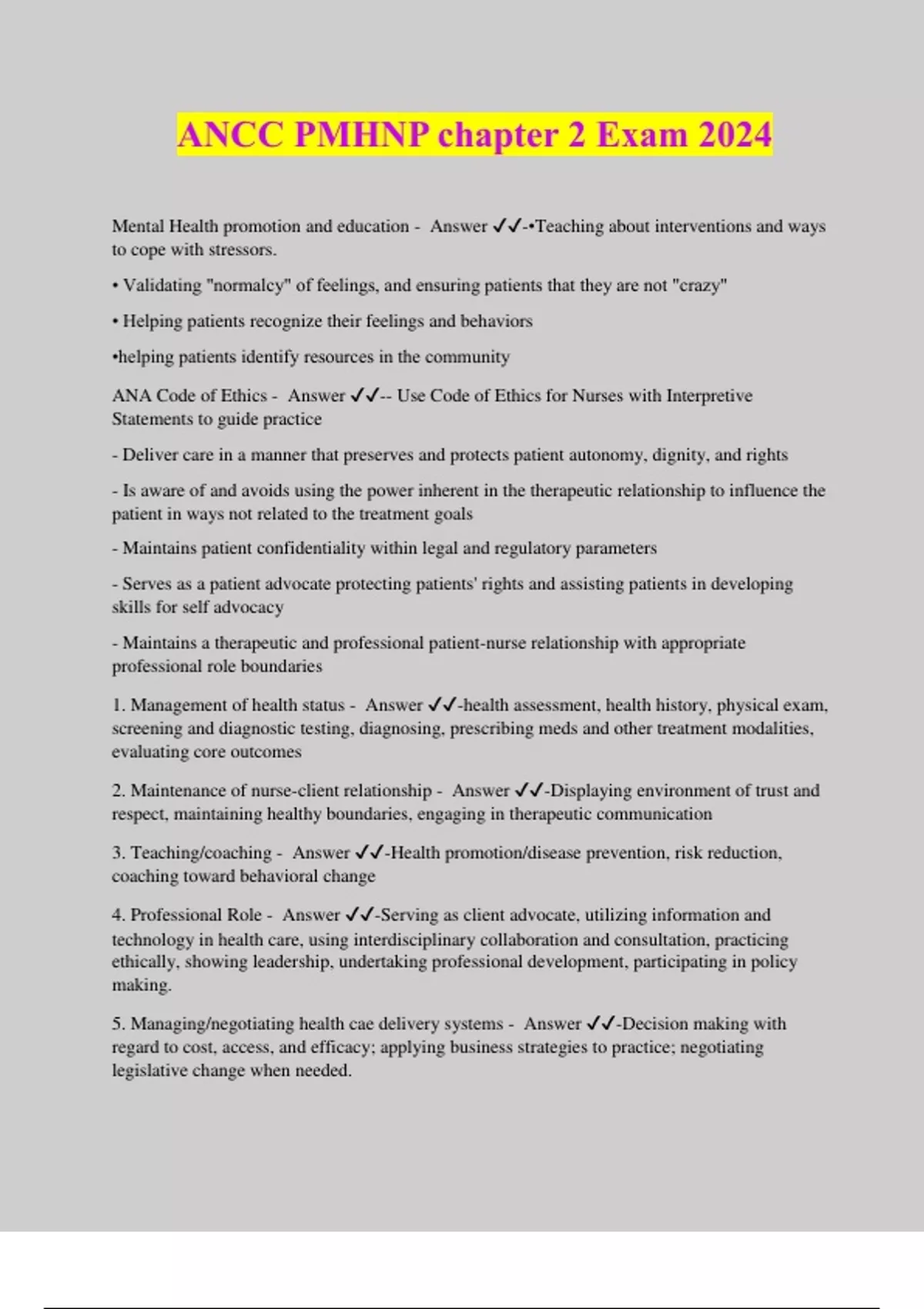 ANCC PMHNP chapter 2 Exam 2024 Mental Health promotion and education - Answer ️️ -•Teaching about interventions and ways to cope with stressors. • Validating "normalcy" of feelings, and ensuring patients that they are not "crazy" • Helping patients recognize their feelings and behaviors •helping patients identify resources in the community ANA Code of Ethics - Answer ️️ -- Use Code of Ethics for Nurses with Interpretive Statements to guide practice - Deliver care in a manner that preserves and protects patient autonomy, dignity, and rights - Is aware of and avoids using the power inherent in the therapeutic relationship to influence the patient in ways not related to the treatment goals - Maintains patient confidentiality within legal and regulatory parameters - Serves as a patient advocate protecting patients' rights and assisting patients in developing skills for self advocacy - Maintains a therapeutic and professional patient-nurse relationship with appropriate professional role boundaries 1. Management of health status - Answer ️️ -health assessment, health history, physical exam, screening and diagnostic testing, diagnosing, prescribing meds and other treatment modalities, evaluating core outcomes 2. Maintenance of nurse-client relationship - Answer ️️ -Displaying environment of trust and respect, maintaining healthy boundaries, engaging in therapeutic communication 3. Teaching/coaching - Answer ️️ -Health promotion/disease prevention, risk reduction, coaching toward behavioral change 4. Professional Role - Answer ️️ -Serving as client advocate, utilizing information and technology in health care, using interdisciplinary collaboration and consultation, practicing ethically, showing leadership, undertaking professional development, participating in policy making. 5. Managing/negotiating health cae delivery systems - Answer ️️ -Decision making with regard to cost, access, and efficacy; applying business strategies to practice; negotiating legislative change when needed.
