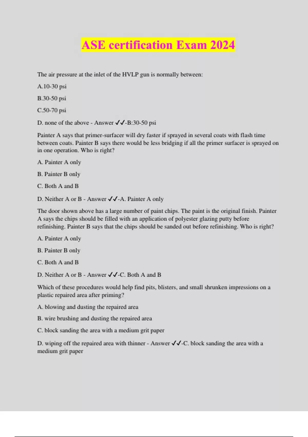 ASE certification Exam 2024 The air pressure at the inlet of the HVLP gun is normally between: A.10-30 psi B.30-50 psi C.50-70 psi D. none of the above - Answer ️️ -B:30-50 psi Painter A says that primer-surfacer will dry faster if sprayed in several coats with flash time between coats. Painter B says there would be less bridging if all the primer surfacer is sprayed on in one operation. Who is right? A. Painter A only B. Painter B only C. Both A and B D. Neither A or B - Answer ️️ -A. Painter A only The door shown above has a large number of paint chips. The paint is the original finish. Painter A says the chips should be filled with an application of polyester glazing putty before refinishing. Painter B says that the chips should be sanded out before refinishing. Who is right? A. Painter A only B. Painter B only C. Both A and B D. Neither A or B - Answer ️️ -C. Both A and B Which of these procedures would help find pits, blisters, and small shrunken impressions on a plastic repaired area after priming? A. blowing and dusting the repaired area B. wire brushing and dusting the repaired area C. block sanding the area with a medium grit paper D. wiping off the repaired area with thinner - Answer ️️ -C. block sanding the area with a medium grit paper Painter A says that if one of the air holes labeled 'A' is blocked with dry paint, it would cause the spray gun pattern shown above. Painter B says that is the on the air holes labeled 'B' is blocked with dry paint, it would cause the spray gun pattern shown above. Who is right? A. Painter A only B. Painter B only C. Both A and B D. Neither A or B - Answer ️️ -A. Painter A onl