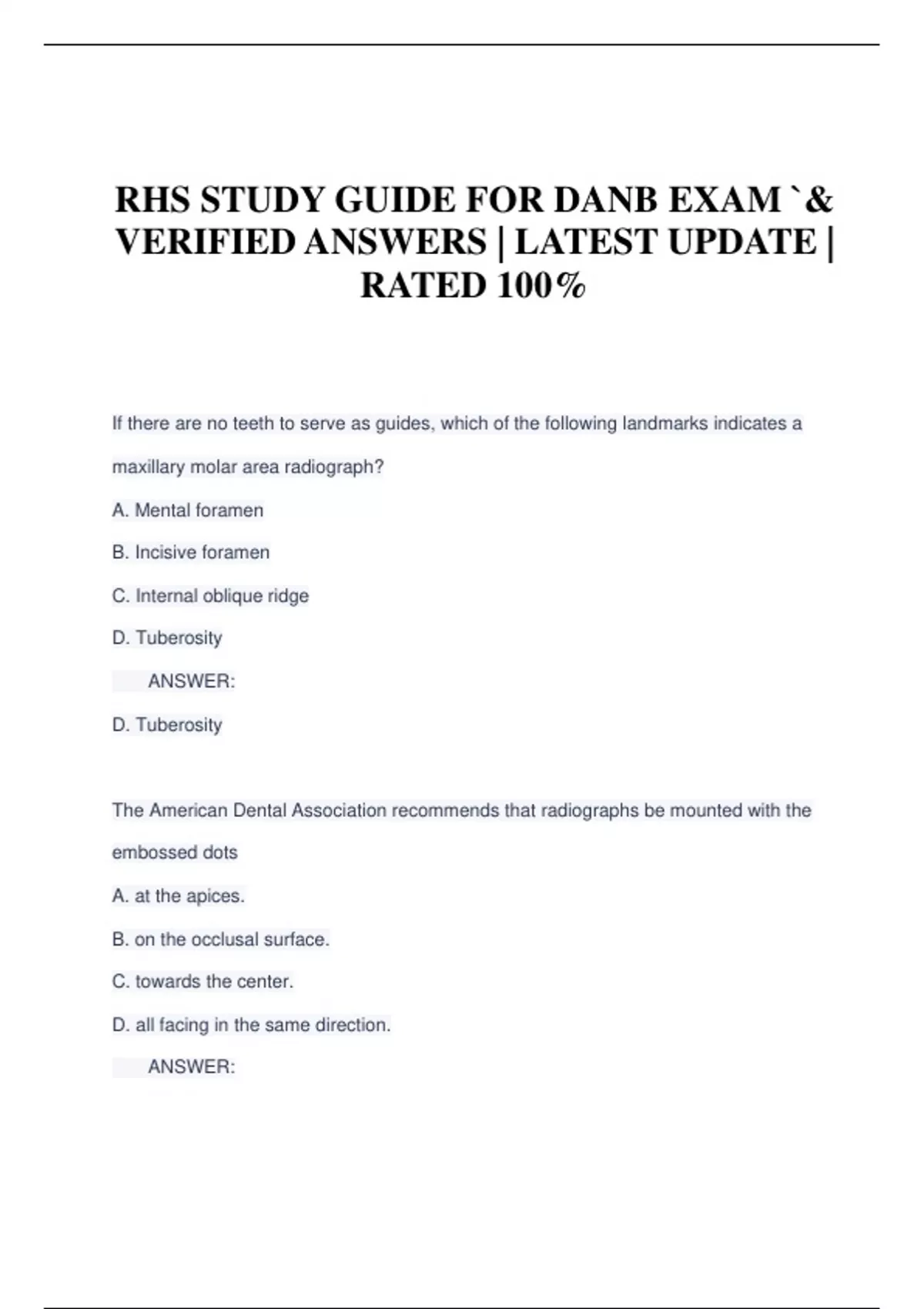 RHS STUDY GUIDE FOR DANB EXAM `& VERIFIED ANSWERS | LATEST UPDATE | RATED 100%