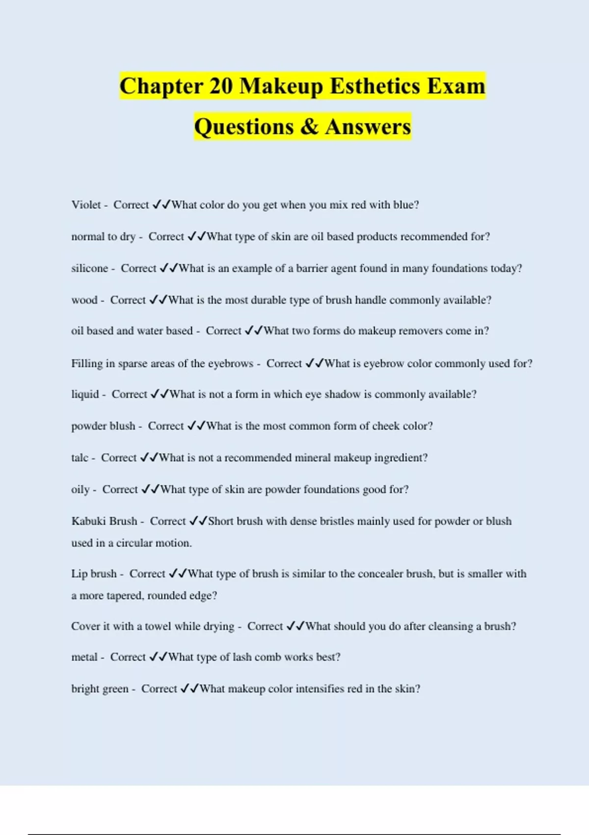 Esthetics Chapter 20 Makeup Exam Questions and Answers | Latest 2024