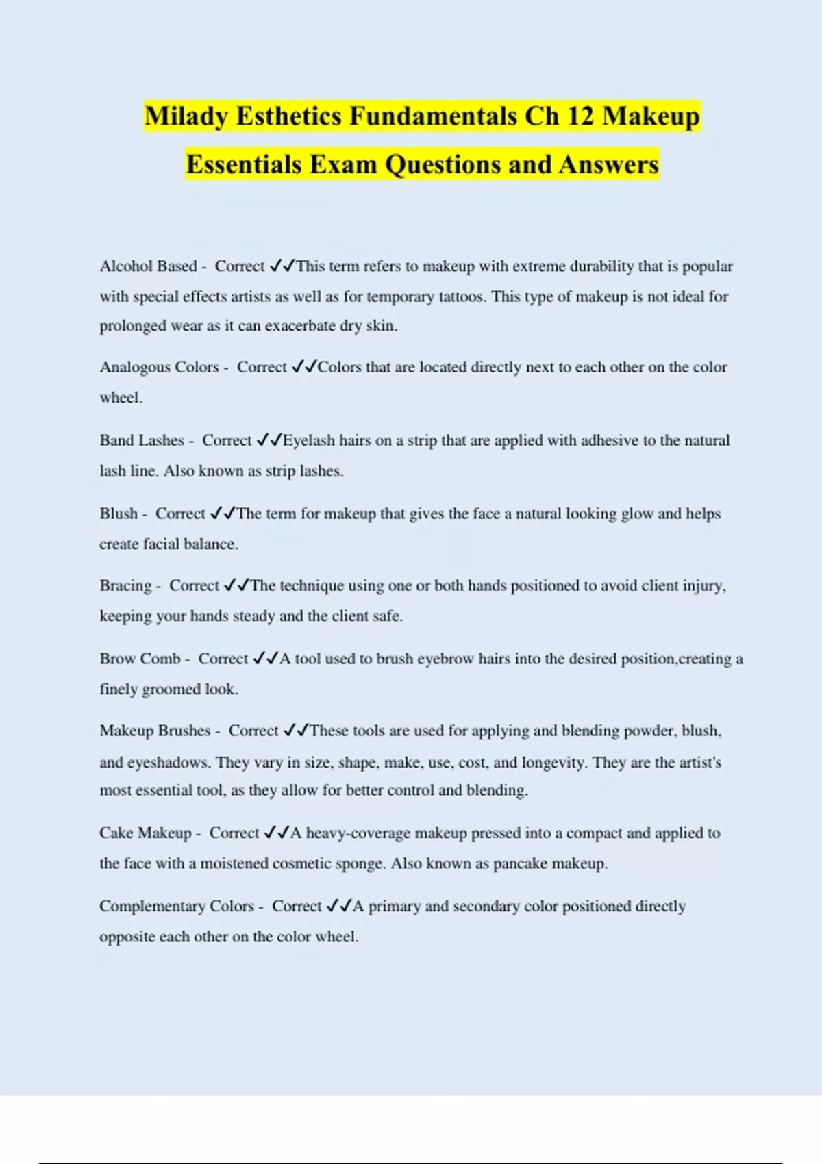 Milady Esthetics Fundamentals Ch 12 Makeup Essentials Exam Questions and Answers