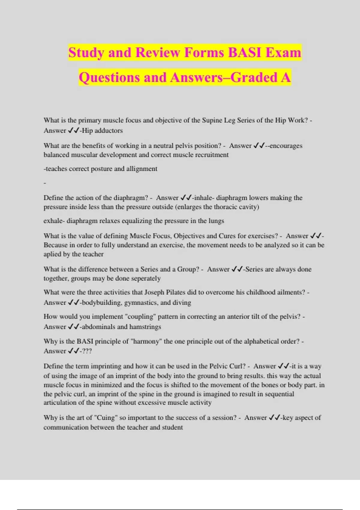 Study and Review Forms BASI Exam Questions and Answers–Graded A What is the primary muscle focus and objective of the Supine Leg Series of the Hip Work? - Answer ️️ -Hip adductors What are the benefits of working in a neutral pelvis position? - Answer ️️ --encourages balanced muscular development and correct muscle recruitment -teaches correct posture and allignment - Define the action of the diaphragm? - Answer ️️ -inhale- diaphragm lowers making the pressure inside less than the pressure outside (enlarges the thoracic cavity) exhale- diaphragm relaxes equalizing the pressure in the lungs What is the value of defining Muscle Focus, Objectives and Cures for exercises? - Answer ️️ - Because in order to fully understand an exercise, the movement needs to be analyzed so it can be aplied by the teacher What is the difference between a Series and a Group? - Answer ️️ -Series are always done together, groups may be done seperately What were the three activities that Joseph Pilates did to overcome his childhood ailments? - Answer ️️ -bodybuilding, gymnastics, and diving How would you implement "coupling" pattern in correcting an anterior tilt of the pelvis? - Answer ️️ -abdominals and hamstrings Why is the BASI principle of "harmony" the one principle out of the alphabetical order? - Answer ️️ -??? Define the term imprinting and how it can be used in the Pelvic Curl? - Answer ️️ -it is a way of using the image of an imprint of the body into the ground to bring results. this way the actual muscle focus in minimized and the focus is shifted to the movement of the bones or body part. in the pelvic curl, an imprint of the spine in the ground is imagined to result in sequential articulation of the spine without excessive muscle activity Why is the art of "Cuing" so important to the success of a session? - Answer ️️ -key aspect of communication between the teacher and studen