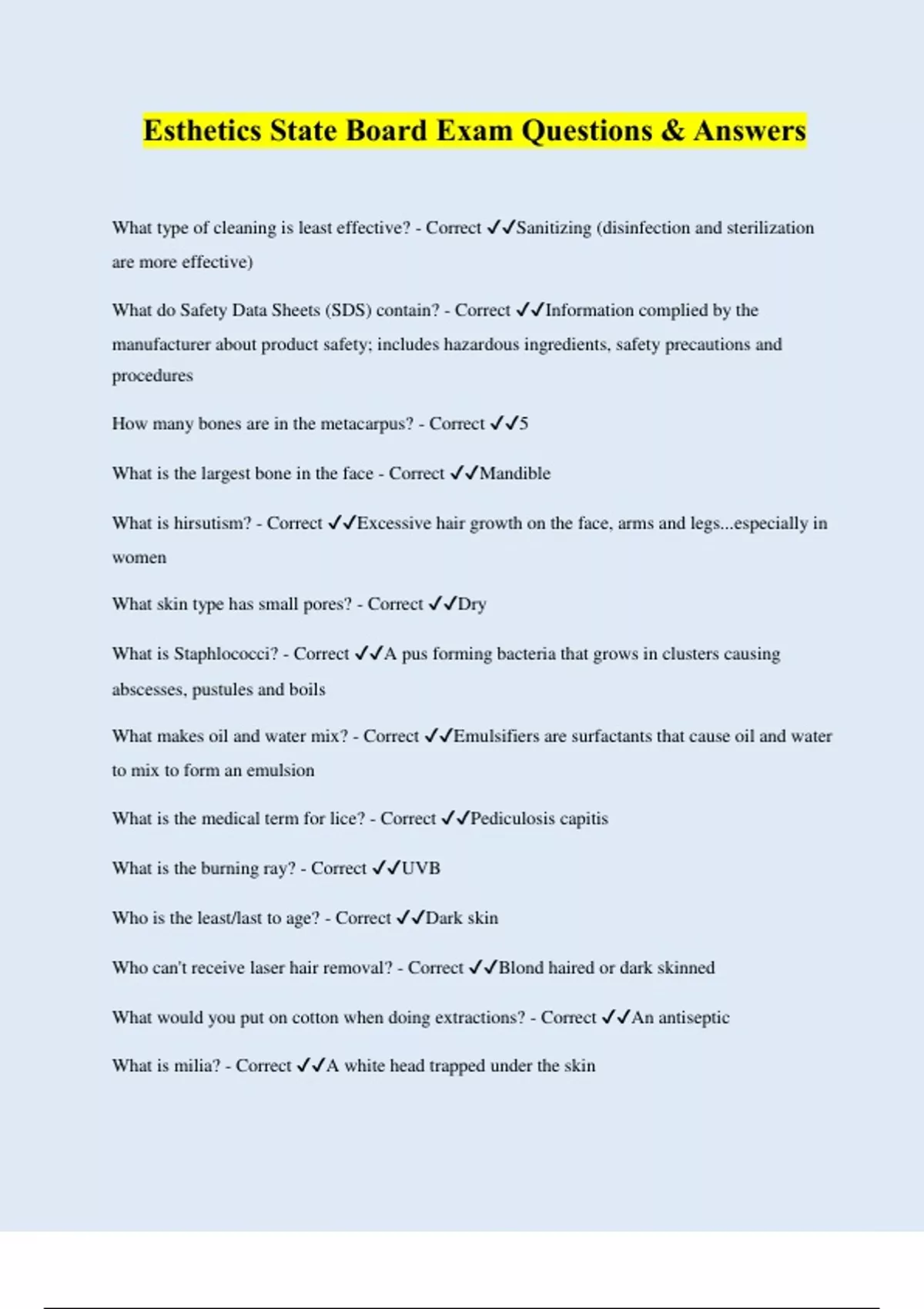 Esthetics State Board Exam Questions and Answers | Latest 2024
