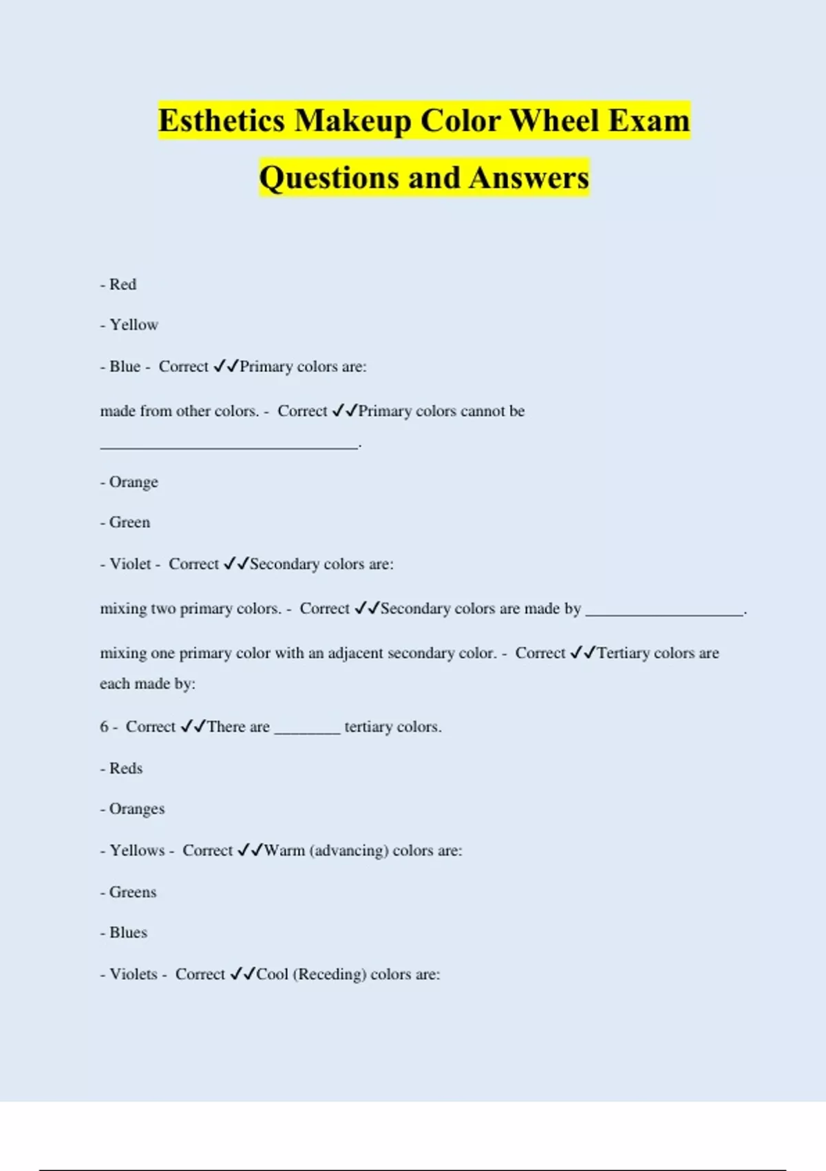 Esthetics Makeup Color Wheel Exam Questions and Answers | latest 2024