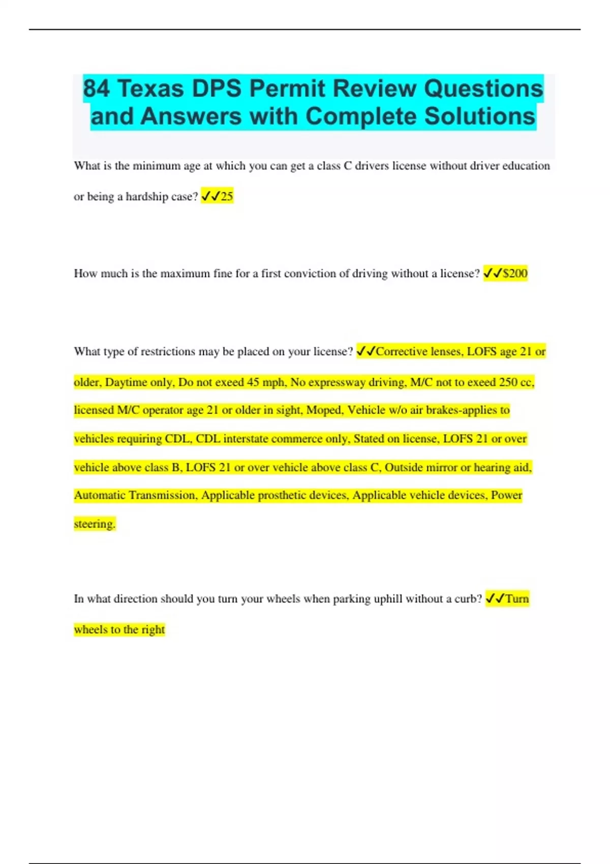 What is the minimum age at which you can get a class C drivers license without driver education or being a hardship case? 25 How much is the maximum fine for a first conviction of driving without a license? $200 What type of restrictions may be placed on your license? Corrective lenses, LOFS age 21 or older, Daytime only, Do not exeed 45 mph, No expressway driving, M/C not to exeed 250 cc, licensed M/C operator age 21 or older in sight, Moped, Vehicle w/o air brakes-applies to vehicles requiring CDL, CDL interstate commerce only, Stated on license, LOFS 21 or over vehicle above class B, LOFS 21 or over vehicle above class C, Outside mirror or hearing aid, Automatic Transmission, Applicable prosthetic devices, Applicable vehicle devices, Power steering. In what direction should you turn your wheels when parking uphill without a curb? Turn wheels to the right