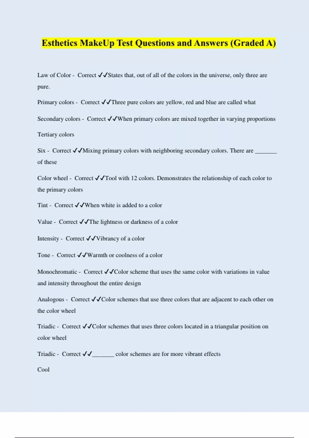 Esthetics MakeUp Test Questions and Answers Graded A+ | Latest 2024