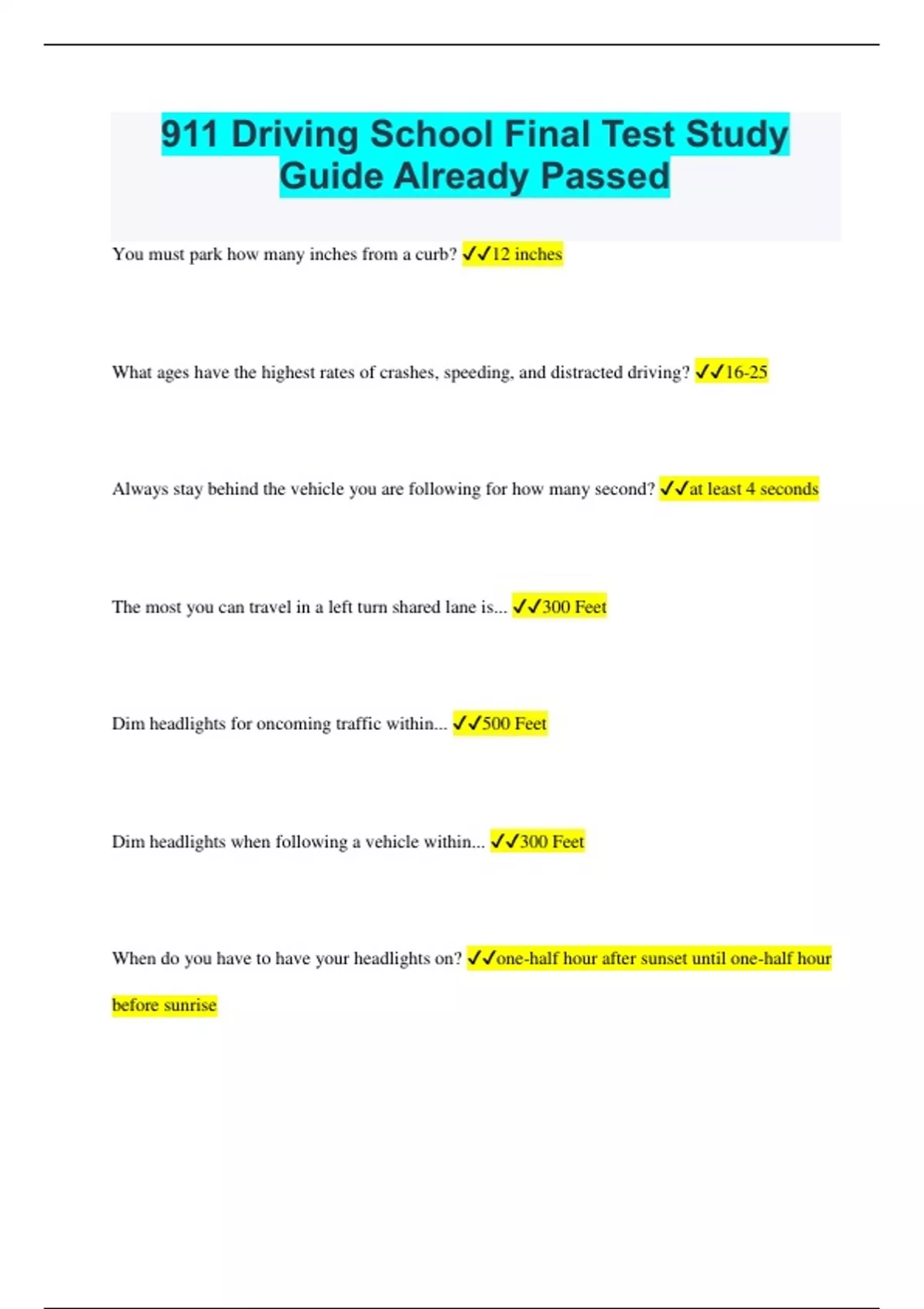 You must park how many inches from a curb? 12 inches What ages have the highest rates of crashes, speeding, and distracted driving? 16-25 Always stay behind the vehicle you are following for how many second? at least 4 seconds The most you can travel in a left turn shared lane is... 300 Feet