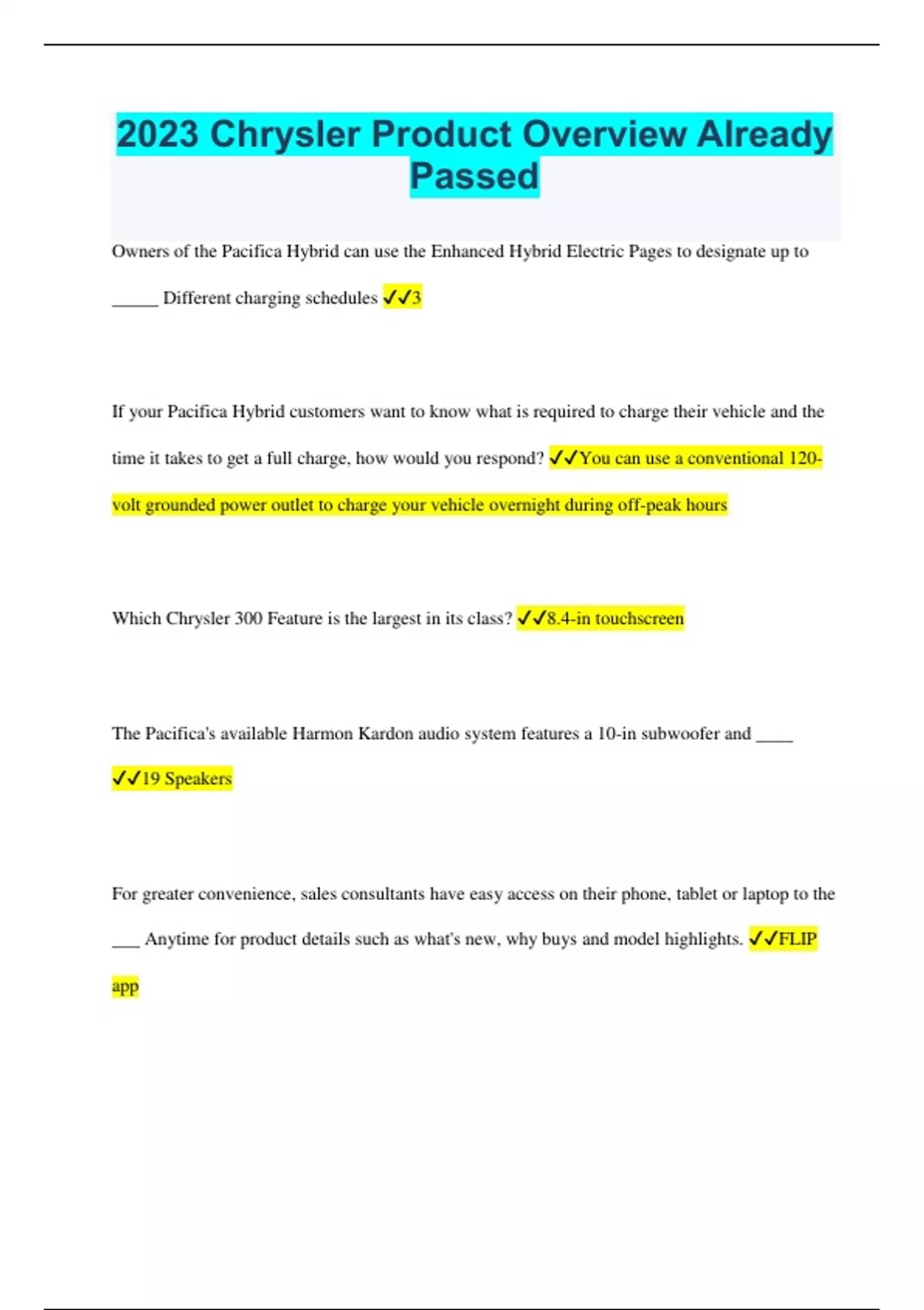 Owners of the Pacifica Hybrid can use the Enhanced Hybrid Electric Pages to designate up to _____ Different charging schedules 3 If your Pacifica Hybrid customers want to know what is required to charge their vehicle and the time it takes to get a full charge, how would you respond? You can use a conventional 120- volt grounded power outlet to charge your vehicle overnight during off-peak hours Which Chrysler 300 Feature is the largest in its class? 8.4-in touchscreen The Pacifica's available Harmon Kardon audio system features a 10-in subwoofer and ____ 19 Speakers