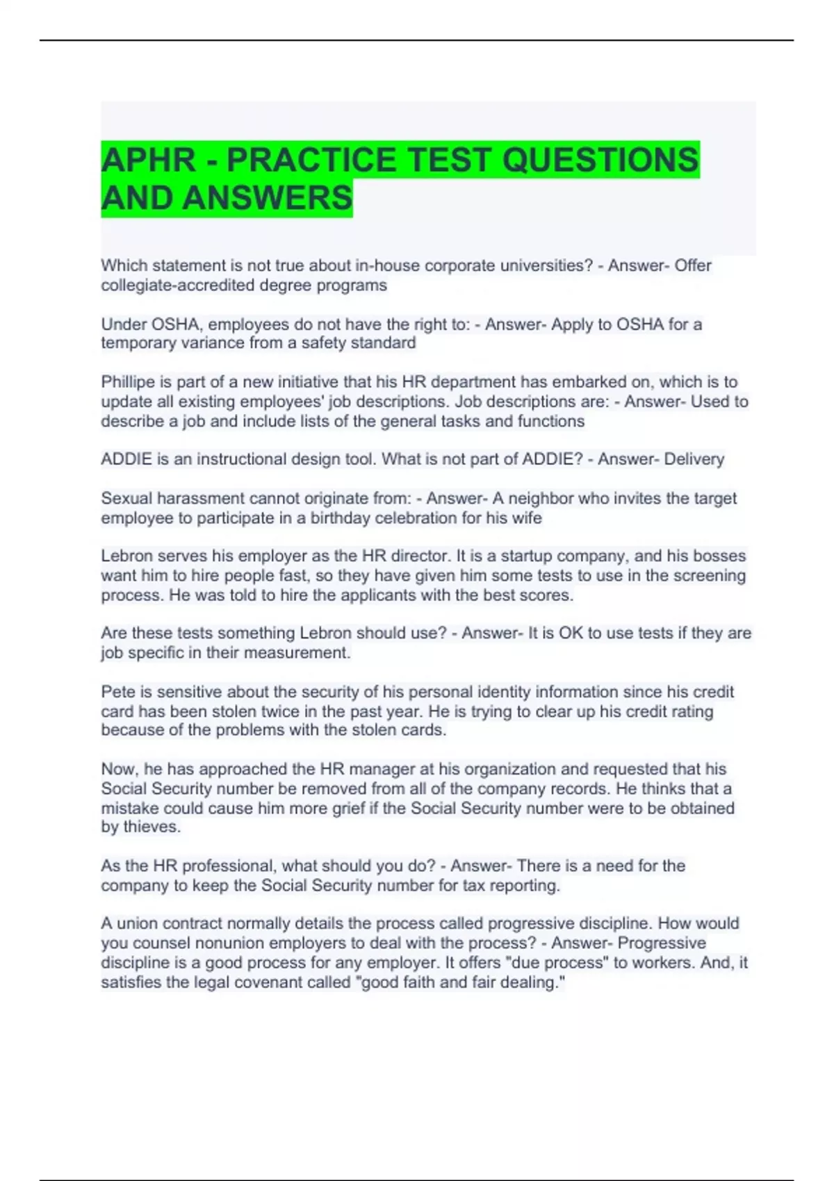 APHR - PRACTICE TEST QUESTIONS AND ANSWERS
