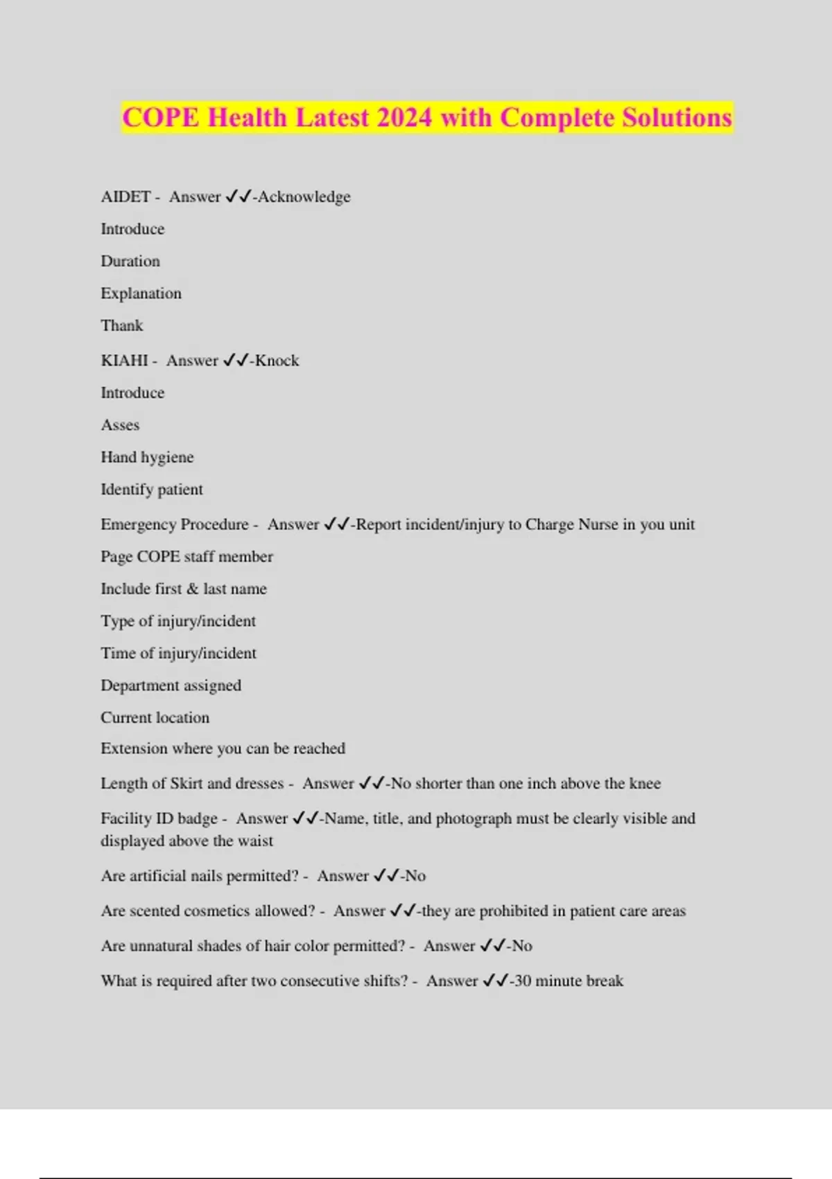COPE Health Latest 2024 with Complete Solutions AIDET - Answer ️️ -Acknowledge Introduce Duration Explanation Thank KIAHI - Answer ️️ -Knock Introduce Asses Hand hygiene Identify patient Emergency Procedure - Answer ️️ -Report incident/injury to Charge Nurse in you unit Page COPE staff member Include first & last name Type of injury/incident Time of injury/incident Department assigned Current location Extension where you can be reached Length of Skirt and dresses - Answer ️️ -No shorter than one inch above the knee Facility ID badge - Answer ️️ -Name, title, and photograph must be clearly visible and displayed above the waist Are artificial nails permitted? - Answer ️️ -No Are scented cosmetics allowed? - Answer ️️ -they are prohibited in patient care areas Are unnatural shades of hair color permitted? - Answer ️️ -No What is required after two consecutive shifts? - Answer ️️ -30 minute break