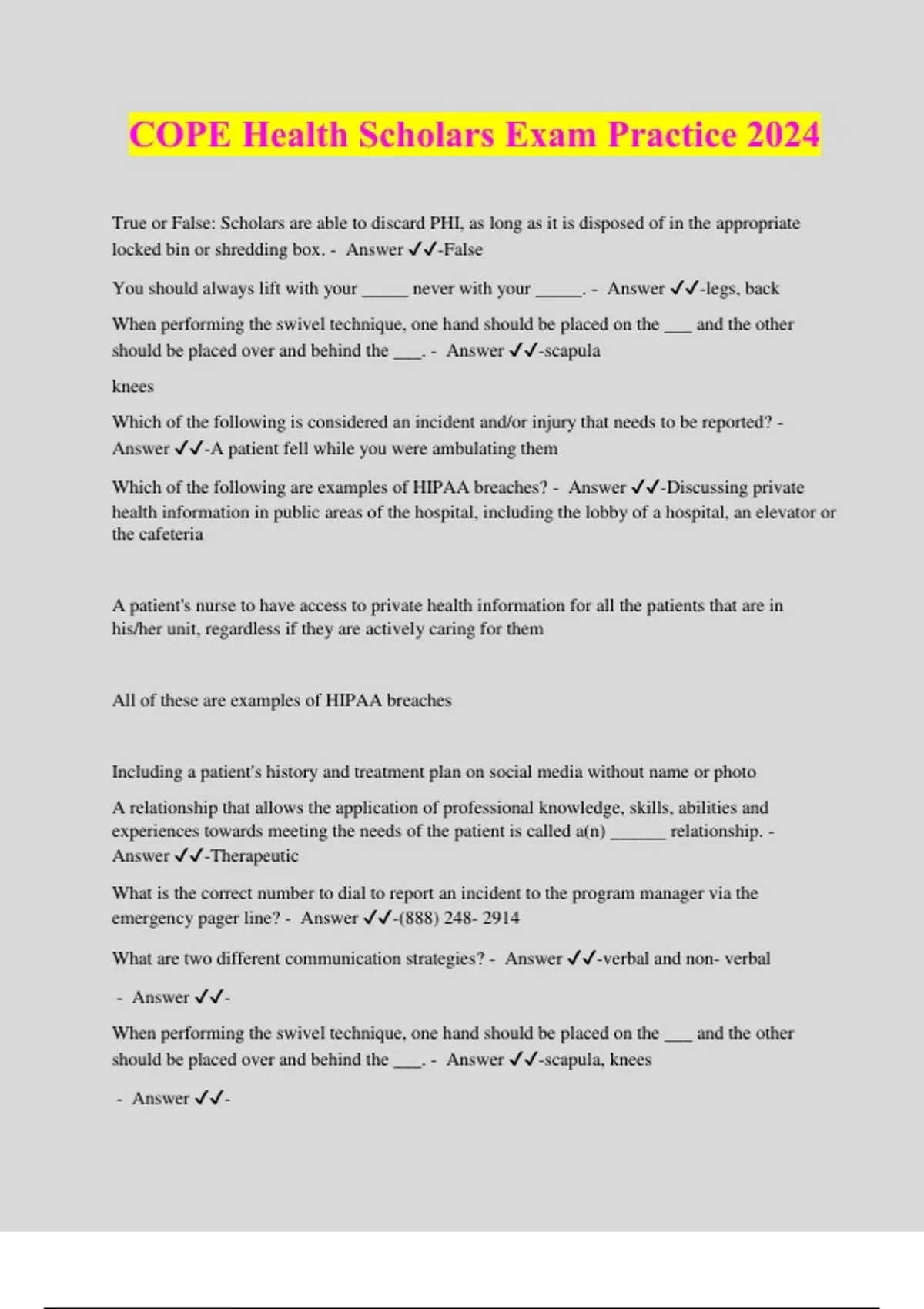COPE Health Scholars Exam Practice 2024 True or False: Scholars are able to discard PHI, as long as it is disposed of in the appropriate locked bin or shredding box. - Answer ️️ -False You should always lift with your _____ never with your _____. - Answer ️️ -legs, back When performing the swivel technique, one hand should be placed on the ___ and the other should be placed over and behind the ___. - Answer ️️ -scapula knees Which of the following is considered an incident and/or injury that needs to be reported? - Answer ️️ -A patient fell while you were ambulating them Which of the following are examples of HIPAA breaches? - Answer ️️ -Discussing private health information in public areas of the hospital, including the lobby of a hospital, an elevator or the cafeteria A patient's nurse to have access to private health information for all the patients that are in his/her unit, regardless if they are actively caring for them All of these are examples of HIPAA breaches Including a patient's history and treatment plan on social media without name or photo A relationship that allows the application of professional knowledge, skills, abilities and experiences towards meeting the needs of the patient is called a(n) ______ relationship. - Answer ️️ -Therapeutic What is the correct number to dial to report an incident to the program manager via the emergency pager line? - Answer ️️ -(888) 248- 2914 What are two different communication strategies? - Answer ️️ -verbal and non- verbal