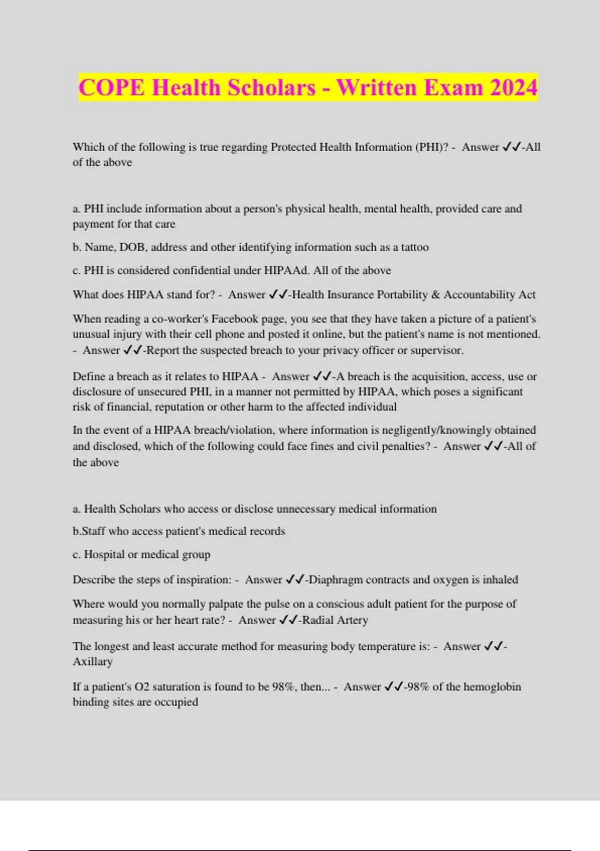 COPE Health Scholars - Written Exam 2024 Which of the following is true regarding Protected Health Information (PHI)? - Answer ️️ -All of the above a. PHI include information about a person's physical health, mental health, provided care and payment for that care b. Name, DOB, address and other identifying information such as a tattoo c. PHI is considered confidential under HIPAAd. All of the above What does HIPAA stand for? - Answer ️️ -Health Insurance Portability & Accountability Act When reading a co-worker's Facebook page, you see that they have taken a picture of a patient's unusual injury with their cell phone and posted it online, but the patient's name is not mentioned. - Answer ️️ -Report the suspected breach to your privacy officer or supervisor. Define a breach as it relates to HIPAA - Answer ️️ -A breach is the acquisition, access, use or disclosure of unsecured PHI, in a manner not permitted by HIPAA, which poses a significant risk of financial, reputation or other harm to the affected individual In the event of a HIPAA breach/violation, where information is negligently/knowingly obtained and disclosed, which of the following could face fines and civil penalties? - Answer ️️ -All of the above a. Health Scholars who access or disclose unnecessary medical information b.Staff who access patient's medical records c. Hospital or medical group Describe the steps of inspiration: - Answer ️️ -Diaphragm contracts and oxygen is inhaled Where would you normally palpate the pulse on a conscious adult patient for the purpose of measuring his or her heart rate? - Answer ️️ -Radial Artery The longest and least accurate method for measuring body temperature is: - Answer ️️ - Axillary If a patient's O2 saturation is found to be 98%, then... - Answer ️️ -98% of the hemoglobin binding sites are occupied