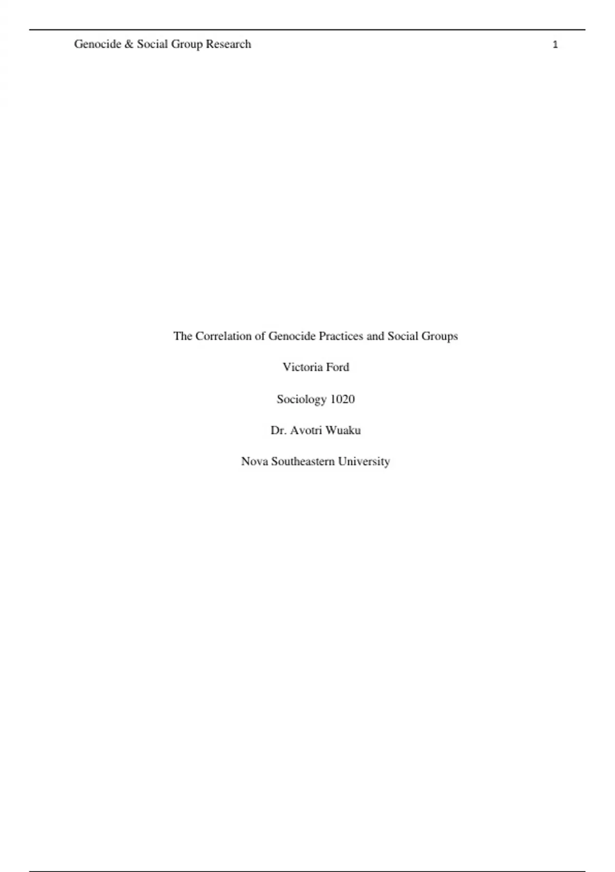 Assignment Criteria: What is Genocide? Read on 4 different genocides Summarize your findings: Be brief here. –Which country –When / time, how long it lasted –Perpetrators and number of victims? 3. How does the discussion on Social Groups help us understand why genocides occur? Connect your research findings to at least TWO concepts identified in the discussion of Social groups. Paper must not be more than One and half pages long. Page numbers exclude the cover page. Remember to cite your sources. Grade Received: 2 out of 2