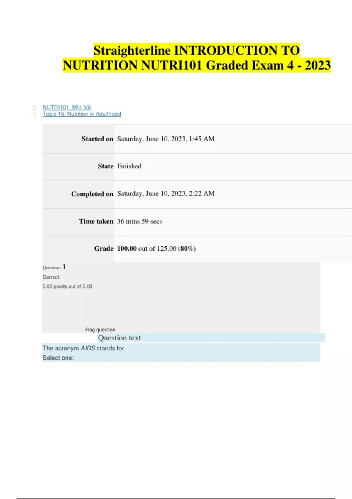 Straighterline INTRODUCTION TO NUTRITION NUTRI101 Graded Exam 4 - 2023