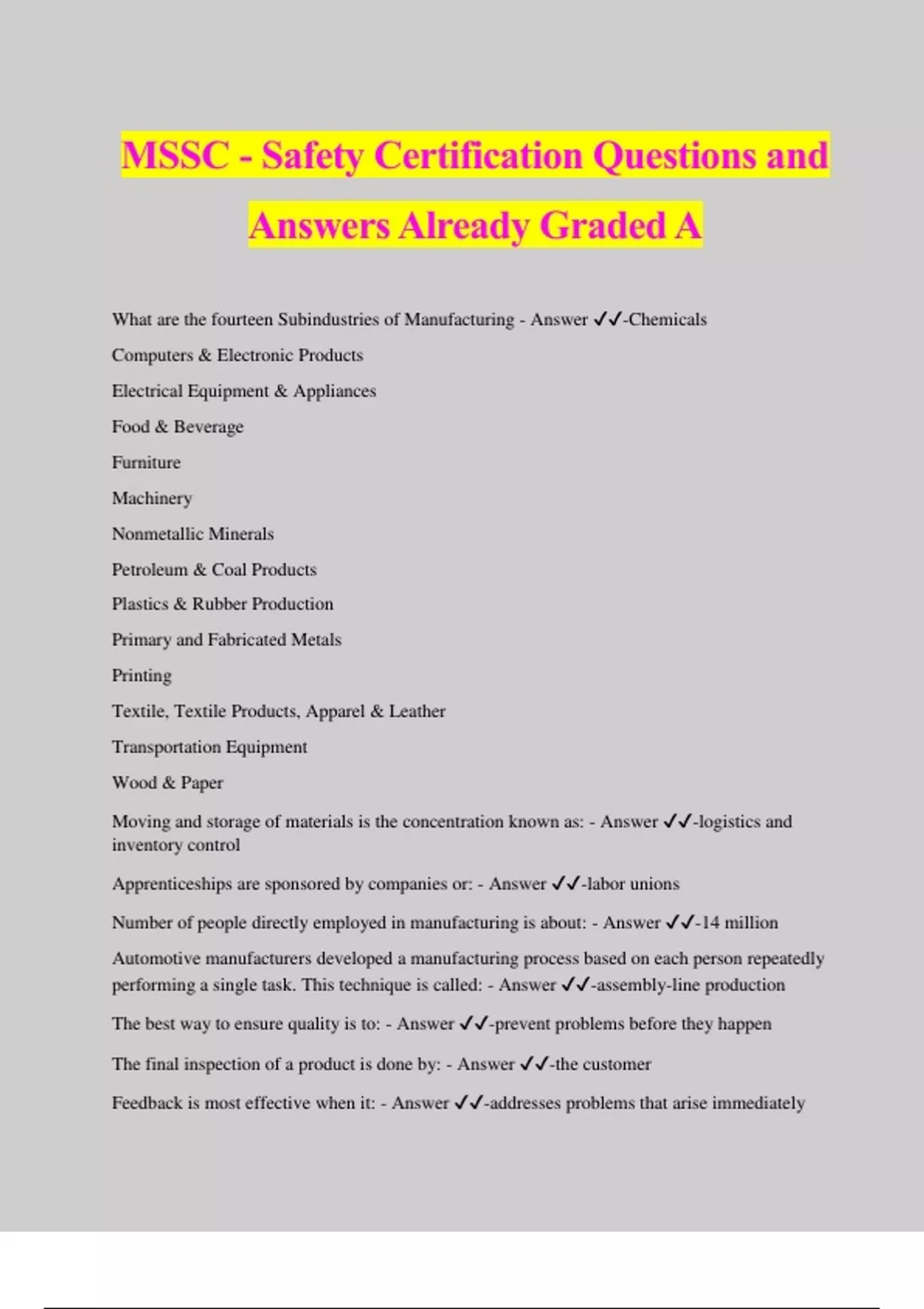 MSSC - Safety Certification Questions and Answers Already Graded A What are the fourteen Subindustries of Manufacturing - Answer ️️ -Chemicals Computers & Electronic Products Electrical Equipment & Appliances Food & Beverage Furniture Machinery Nonmetallic Minerals Petroleum & Coal Products Plastics & Rubber Production Primary and Fabricated Metals Printing Textile, Textile Products, Apparel & Leather Transportation Equipment Wood & Paper Moving and storage of materials is the concentration known as: - Answer ️️ -logistics and inventory control Apprenticeships are sponsored by companies or: - Answer ️️ -labor unions Number of people directly employed in manufacturing is about: - Answer ️️ -14 million Automotive manufacturers developed a manufacturing process based on each person repeatedly performing a single task. This technique is called: - Answer ️️ -assembly-line production The best way to ensure quality is to: - Answer ️️ -prevent problems before they happen The final inspection of a product is done by: - Answer ️️ -the customer Feedback is most effective when it: - Answer ️️ -addresses problems that arise immediately Define the 5 Classes of Fire: - Answer ️️ -Class A Wood, Paper, Cloth, Plastic Class B Grease, Oil, Chemicals Class C Electrical Cords, Switches, Wiring Class D Combustible Switches, Wiring, Metals Class K Fires in Cooking Appliances Involving Combustible Oils/Fats Describe the Fire Extinguisher Symbols: - Answer ️️ -Class A Green Triangle Class B Red Square Class C Blue Circle Class D Yellow Decagon Describe the 3 conditions needed for fire: - Answer ️️ -Fuel, Oxygen, Heat Three examples of engineering controls are: - Answer ️️ -ventilation systems, machine guards, and circuit breakers According to one government study, an employee with less than one year of experience is: - Answer ️️ -40% more likely to be injured A simple covering for the lower part of the face is known as a: - Answer ️️ -dust mask OSHA recommends that hot work be done in special areas where there are no flammable or combustible materials. If these materials are present, the permit requires that hot work be done: - Answer ️️ -at least 35 feet away from them The Hazardous Material Identification System rates health, flammability, and physical hazard categories. On such a scale, a high level of danger is indicated by: - Answer ️️ -the number 4 When oxygen and acetylene cylinders are stored together, there must be a solid barrier wall or a distance of: - Answer ️️ -at least 20 feet between them Miscommunication on the job can have serious consequences. All of the following could be caused by miscommunication except. A. wasted materials B. customer satisfaction C. wasted time D. quality problems: - Answer ️️ -B. customer satisfaction A major cause of mistakes in manufacturing is: - Answer ️️ -lack of communication between shifts Define the 3 team roles: - Answer ️️ -leader, contributor, encourager Each team goal should be SMART. What does the acronym describe: - Answer ️️ -specific, measurable, achievable, relevant, time based The effectiveness of teams depends on cooperation among members with different skills and work styles. In order for the team to be effective, its members need to focus on: - Answer ️️ - completing the task and building positive relationships Teams can use several strategies to reach a decision. They key point of a consensus decision is that: - Answer ️️ -team members support the decision even if they are not completely satisfied The goal of conflict resolution is to: - Answer ️️ -find a permanent solution to a specific problem If you are assigned to train someone else, it is important to: - Answer ️️ -record everything that you do The final step of on-the-job training is: - Answer ️️ -following up over time to be sure the task was learned External customer refers: - Answer ️️ -to the person or business who buys the product Internal customers include all of the following, except: - Answer ️️ -consumers of the product Some tools require frequent calibration against a standard. This process is generally required for: - Answer ️️ -any type of test equipment One precaution, to minimize the risk of explosion when power tools must be used, is to use only: - Answer ️️ -pneumatic power to