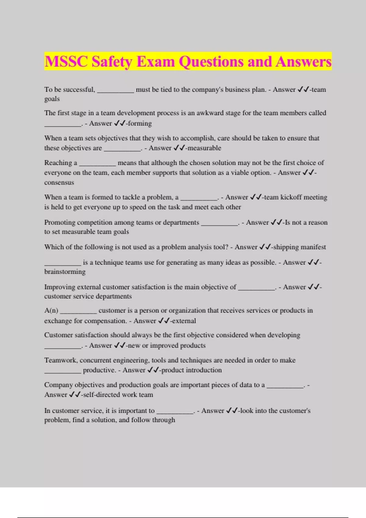 MSSC Safety Exam Questions and Answers To be successful, __________ must be tied to the company's business plan. - Answer ️️ -team goals The first stage in a team development process is an awkward stage for the team members called __________. - Answer ️️ -forming When a team sets objectives that they wish to accomplish, care should be taken to ensure that these objectives are __________. - Answer ️️ -measurable Reaching a __________ means that although the chosen solution may not be the first choice of everyone on the team, each member supports that solution as a viable option. - Answer ️️ - consensus When a team is formed to tackle a problem, a __________. - Answer ️️ -team kickoff meeting is held to get everyone up to speed on the task and meet each other Promoting competition among teams or departments __________. - Answer ️️ -Is not a reason to set measurable team goals Which of the following is not used as a problem analysis tool? - Answer ️️ -shipping manifest __________ is a technique teams use for generating as many ideas as possible. - Answer ️️ - brainstorming Improving external customer satisfaction is the main objective of __________. - Answer ️️ - customer service departments A(n) __________ customer is a person or organization that receives services or products in exchange for compensation. - Answer ️️ -external Customer satisfaction should always be the first objective considered when developing __________. - Answer ️️ -new or improved products Teamwork, concurrent engineering, tools and techniques are needed in order to make __________ productive. - Answer ️️ -product introduction Company objectives and production goals are important pieces of data to a __________. - Answer ️️ -self-directed work team In customer service, it is important to __________. - Answer ️️ -look into the customer's problem, find a solution, and follow through Which type of customer service information stored in a database could help to improve product quality? - Answer ️️ -concerns customers have with specific products Teams should strictly enforce rules about __________ to minimize conflict. - Answer ️️ - arguing Engineers working with manufacturing to become aware of tooling limitations and other problems that may increase production time and cost is an example of __________. - Answer ️️ -concurrent engineering Vendors could be considered what type of customer? - Answer ️️ -external In a team, the __________ is one who will stimulate or guide the group to think of ideas. - Answer ️️ -facilitator Top level management must support a team for it to be __________. - Answer ️️ -successful __________ is a design methodology that designs features into the product that make it cheaper to manufacture while maintaining its ability to perform its intended function. - Answer ️️ - Design for Manufacturing and Assembly (DFMA) When a customer service agent answers the phone, they should try to answer between the __________. - Answer ️️ -second and the fourth ring During a team meeting, any solutions to the problem being discussed that do not meet one or more of the must-have criteria should be __________. - Answer ️️ -eliminated Supervisors should set measurable objectives to __________. - Answer ️️ -have good performance criteria for review of employee performance Product designers should always consider the effects of tooling design and cost during __________. - Answer ️️ -prototype development To ensure that a team has __________ meetings, rules for team behavior should be enforced. - Answer ️️ -productive Customer service refers to the people and other resources a company devotes to __________. - Answer ️️ -assisting customers A team should develop a spending plan as part of their decision making process __________. - Answer ️️ -to ensure that they do not exceed the amount of money allocated to the project Product design teams should provide an environment that encourages team members to __________. - Answer ️️ -add their design ideas freely __________ must know all the team roles. - Answer ️️ -a team lead