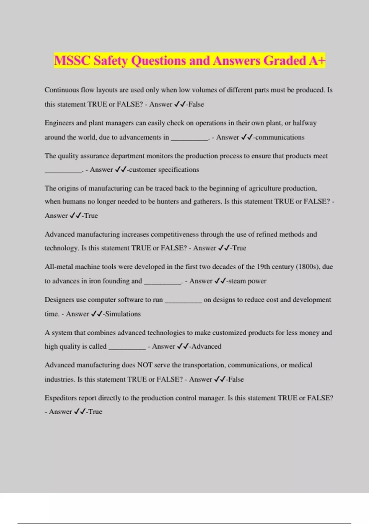 MSSC Safety Questions and Answers Graded A+ Continuous flow layouts are used only when low volumes of different parts must be produced. Is this statement TRUE or FALSE? - Answer ️️ -False Engineers and plant managers can easily check on operations in their own plant, or halfway around the world, due to advancements in __________. - Answer ️️ -communications The quality assurance department monitors the production process to ensure that products meet __________. - Answer ️️ -customer specifications The origins of manufacturing can be traced back to the beginning of agriculture production, when humans no longer needed to be hunters and gatherers. Is this statement TRUE or FALSE? - Answer ️️ -True Advanced manufacturing increases competitiveness through the use of refined methods and technology. Is this statement TRUE or FALSE? - Answer ️️ -True All-metal machine tools were developed in the first two decades of the 19th century (1800s), due to advances in iron founding and __________. - Answer ️️ -steam power Designers use computer software to run __________ on designs to reduce cost and development time. - Answer ️️ -Simulations A system that combines advanced technologies to make customized products for less money and high quality is called __________ - Answer ️️ -Advanced Advanced manufacturing does NOT serve the transportation, communications, or medical industries. Is this statement TRUE or FALSE? - Answer ️️ -False Expeditors report directly to the production control manager. Is this statement TRUE or FALSE? - Answer ️️ -True The major responsibility of the president or general manager is to __________. - Answer ️️ -set the vision and create a plan What historic event / period marked the beginning of the manufacturing boom in the mid-to-late 18th century (1700s)? - Answer ️️ -The Industrial Revolution Line supervisors direct the __________ in the making or assembling of the products. - Answer ️️ -production operators __________ teams are composed of employees from manufacturing, engineering, and marketing to ensure a product meets the customer's needs and can be economically manufactured. - Answer ️️ -design Many of the products that we eat and drink are advanced manufactured products. Is this statement TRUE or FALSE? - Answer ️️ -True One of the most important assets of advanced manufacturing is the people who work together to develop the products. Is this statement TRUE or FALSE? - Answer ️️ -True The functional manufacturing areas in a company will vary depending on its physical size and/or number of employees. Is this statement TRUE or FALSE? - Answer ️️ -False The International Organization for Standardization (ISO) 9000 is designed to do what? - Answer ️️ -Improve quality and productivity The QA department ensures that the products meet requirements as defined by who? - Answer ️️ -Customers The selection of a production area layout depends on __________. - Answer ️️ -The type of product produced __________ manufacturing creates a product by adding material layer-on-layer. - Answer ️️ - Additive In the early 20th century (1900s), what industry caught the attention of business leaders due to its disciplined effort to improve machinery and processes and roll out mass-produced products on assembly lines? - Answer ️️ -Automobile One of the advantages of incorporating computers into the manufacturing process is that manufacturers can quickly adjust production schedules. Is this statement TRUE or FALSE? - Answer ️️ -True Production equipment downtime is __________ the company. - Answer ️️ -Very costly to In general, operators can be separated into what two groups? - Answer ️️ -Those who set up the machine and those who operate the machine __________ is the process of converting raw materials into finished goods. - Answer ️️ - Manufacturing In the late 20th century (1900s), two major developments impacted advanced manufacturing: quality/productivity tools AND __________. - Answer ️️ -compute