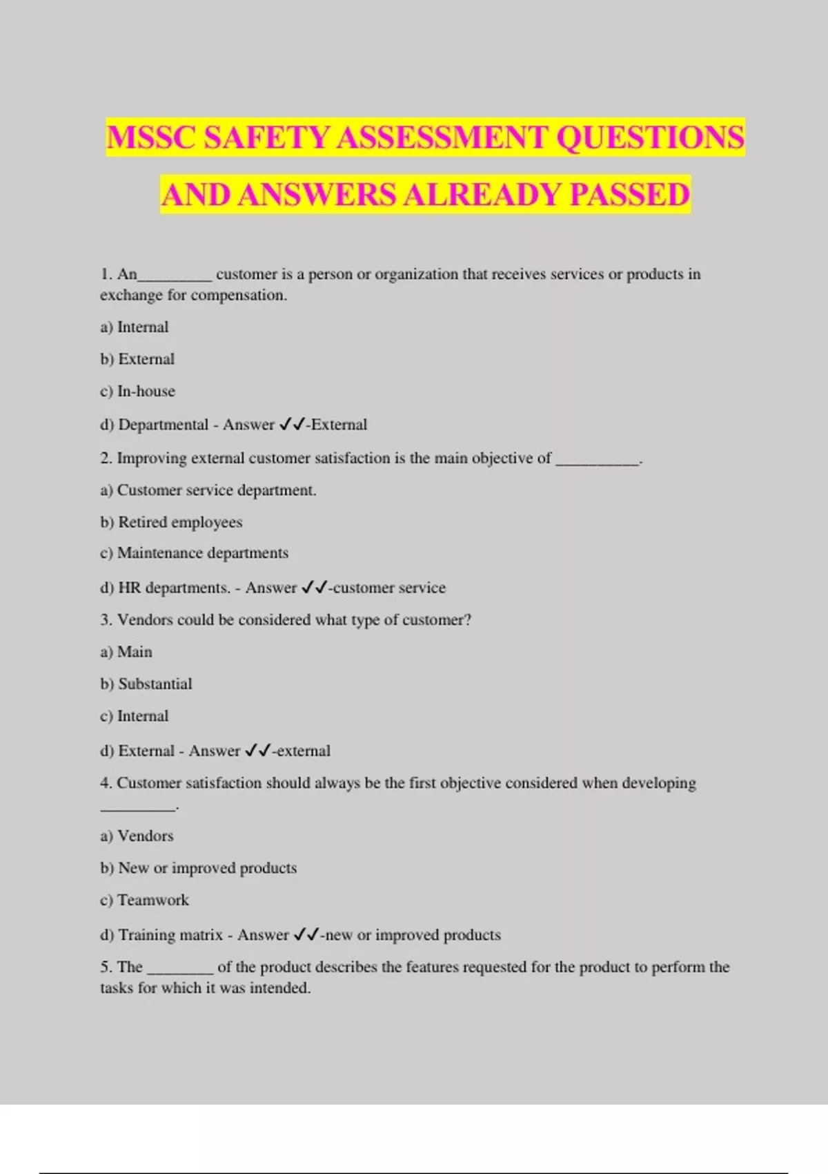 MSSC SAFETY ASSESSMENT QUESTIONS AND ANSWERS ALREADY PASSED 1. An_________ customer is a person or organization that receives services or products in exchange for compensation. a) Internal b) External c) In-house d) Departmental - Answer ️️ -External 2. Improving external customer satisfaction is the main objective of __________. a) Customer service department. b) Retired employees c) Maintenance departments d) HR departments. - Answer ️️ -customer service 3. Vendors could be considered what type of customer? a) Main b) Substantial c) Internal d) External - Answer ️️ -external 4. Customer satisfaction should always be the first objective considered when developing _________. a) Vendors b) New or improved products c) Teamwork d) Training matrix - Answer ️️ -new or improved products 5. The ________ of the product describes the features requested for the product to perform the tasks for which it was intended. a) Form b) Function c) Cost d) Utilization - Answer ️️ -function 6. Product designers should always consider the effects of tooling design and cost during ___________. a) Prototype development b) Process capability studies c) Team kickoff meetings d) Maintenance of a machine - Answer ️️ -prototype development 7. Product design teams should provide an environment that encourages ________. a) Criticize other team members at any time b) Add their design ideas freely c) Attend meetings whenever they are available d) Report team meetings to the boss - Answer ️️ -Add their design ideas free 8. Teamwork, concurrent engineering, tools and techniques are needed in order to make _______________. a) Product introduction b) Sales c) Product scam prevention efforts d) Safety tests - Answer ️️ -Product introduction 9. Engineers working with manufacturing to become aware of tooling limitations and other problems that may increase production time and cost is an example of _____________. a) Brainstorming b) Product analysis c) Concurrent engineering d) Production processing - Answer ️️ -Concurrent engineering 10. _______ is a design methodology that designs features into the product that makes it cheaper to manufacture, while maintaining its ability to perform its intended fu