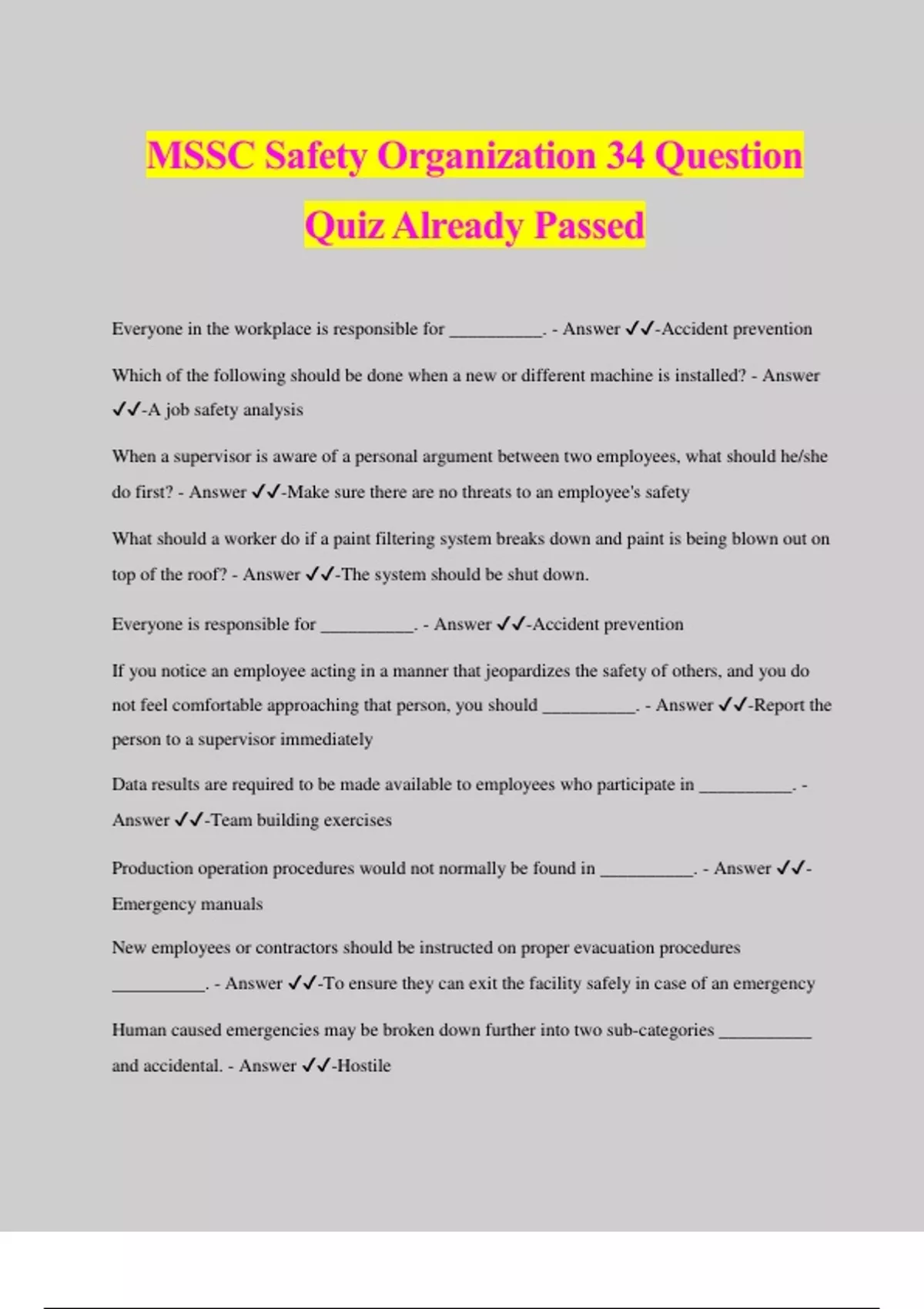 MSSC Safety Organization 34 Question Quiz Already Passed Everyone in the workplace is responsible for __________. - Answer ️️ -Accident prevention Which of the following should be done when a new or different machine is installed? - Answer ️️ -A job safety analysis When a supervisor is aware of a personal argument between two employees, what should he/she do first? - Answer ️️ -Make sure there are no threats to an employee's safety What should a worker do if a paint filtering system breaks down and paint is being blown out on top of the roof? - Answer ️️ -The system should be shut down. Everyone is responsible for __________. - Answer ️️ -Accident prevention If you notice an employee acting in a manner that jeopardizes the safety of others, and you do not feel comfortable approaching that person, you should __________. - Answer ️️ -Report the person to a supervisor immediately Data results are required to be made available to employees who participate in __________. - Answer ️️ -Team building exercises Production operation procedures would not normally be found in __________. - Answer ️️ - Emergency manuals New employees or contractors should be instructed on proper evacuation procedures __________. - Answer ️️ -To ensure they can exit the facility safely in case of an emergency Human caused emergencies may be broken down further into two sub-categories __________ and accidental. - Answer ️️ -Hostile