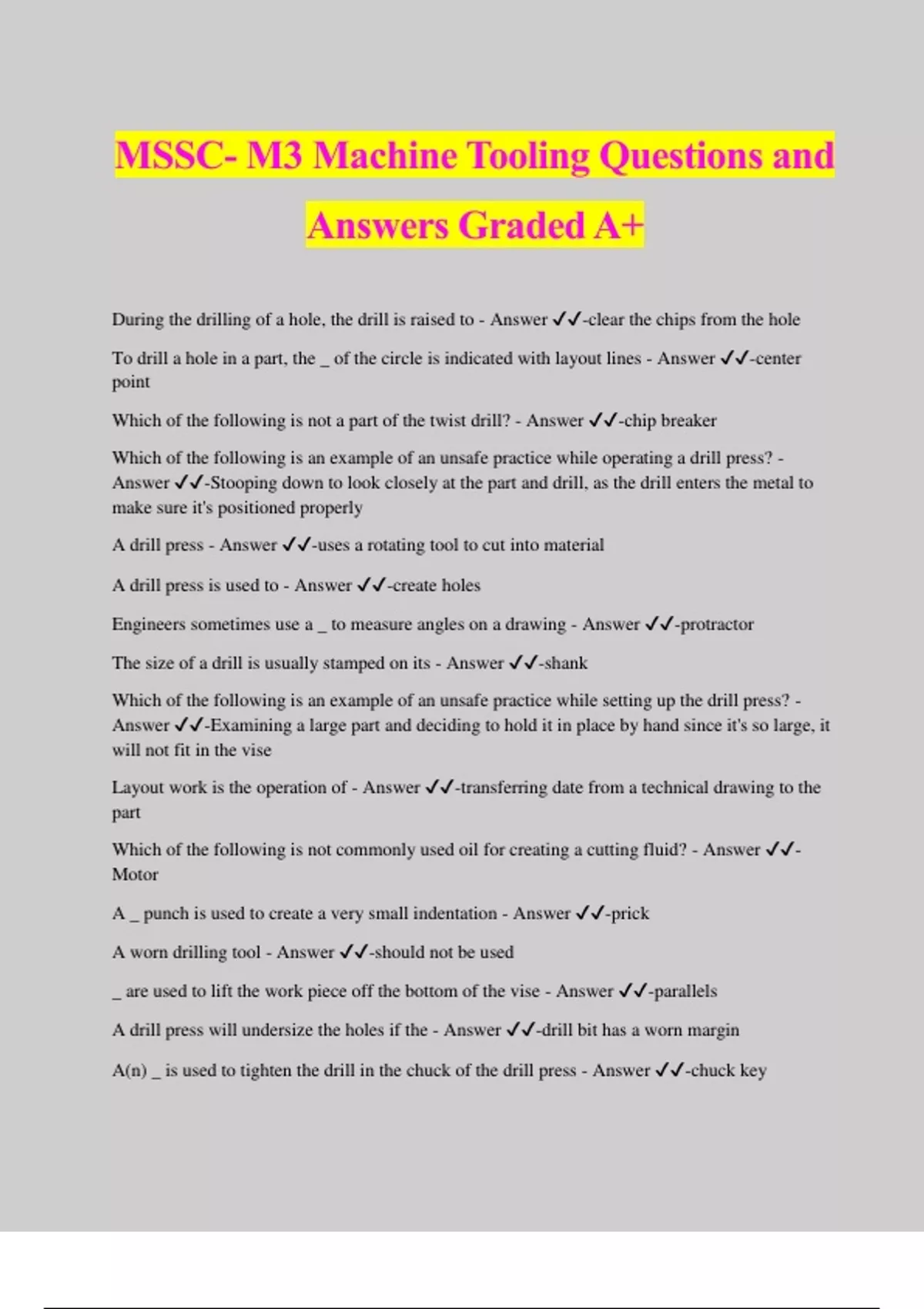 MSSC- M3 Machine Tooling Questions and Answers Graded A+ During the drilling of a hole, the drill is raised to - Answer ️️ -clear the chips from the hole To drill a hole in a part, the _ of the circle is indicated with layout lines - Answer ️️ -center point Which of the following is not a part of the twist drill? - Answer ️️ -chip breaker Which of the following is an example of an unsafe practice while operating a drill press? - Answer ️️ -Stooping down to look closely at the part and drill, as the drill enters the metal to make sure it's positioned properly A drill press - Answer ️️ -uses a rotating tool to cut into material A drill press is used to - Answer ️️ -create holes Engineers sometimes use a _ to measure angles on a drawing - Answer ️️ -protractor The size of a drill is usually stamped on its - Answer ️️ -shank Which of the following is an example of an unsafe practice while setting up the drill press? - Answer ️️ -Examining a large part and deciding to hold it in place by hand since it's so large, it will not fit in the vise Layout work is the operation of - Answer ️️ -transferring date from a technical drawing to the part Which of the following is not commonly used oil for creating a cutting fluid? - Answer ️️ - Motor A _ punch is used to create a very small indentation - Answer ️️ -prick A worn drilling tool - Answer ️️ -should not be us