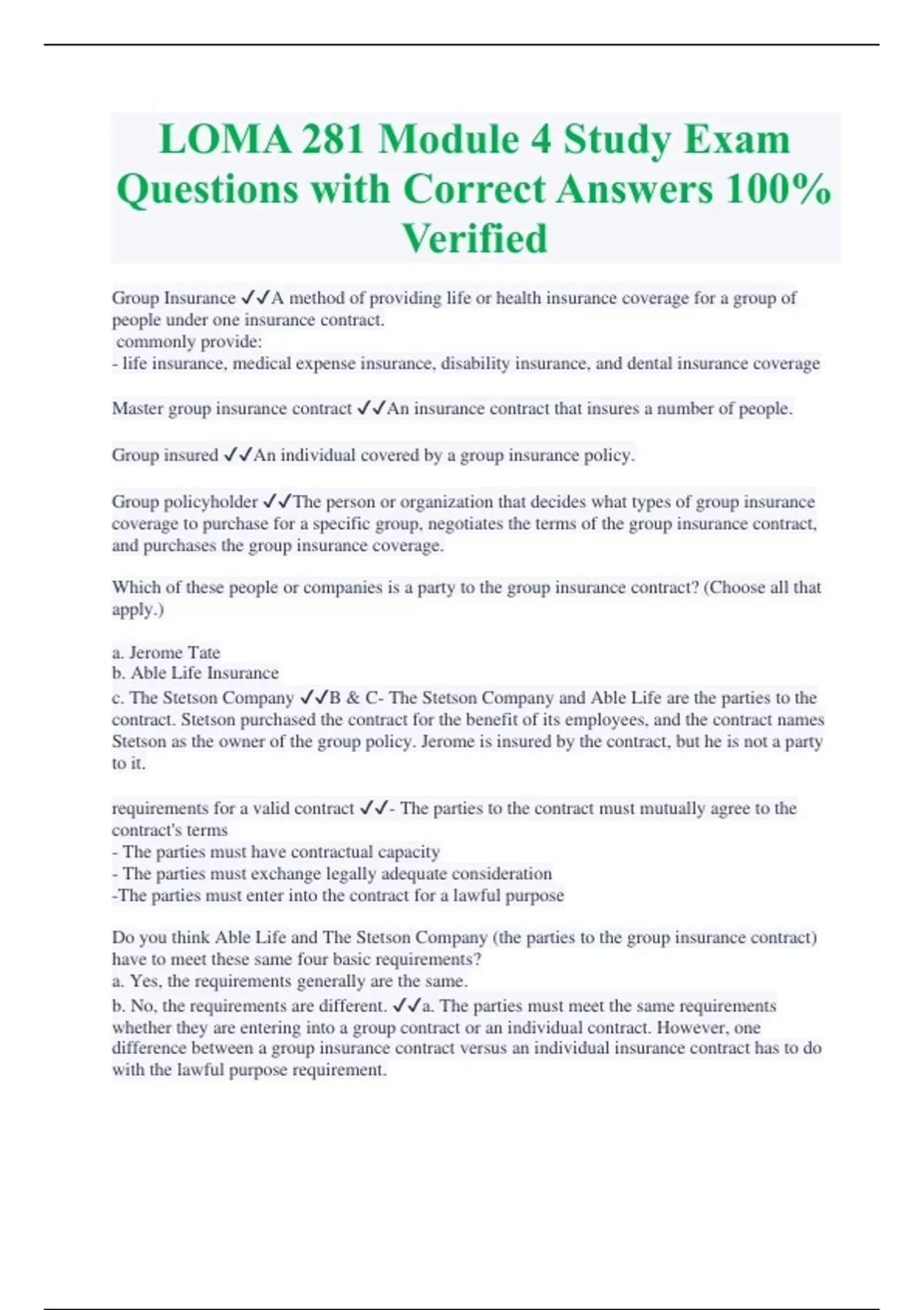 LOMA 281 Module 4 Study Exam Questions with Correct Answers 100% Verified Group Insurance A method of providing life or health insurance coverage for a group of people under one insurance contract. commonly provide: - life insurance, medical expense insurance, disability insurance, and dental insurance coverage Master group insurance contract An insurance contract that insures a number of people. Group insured An individual covered by a group insurance policy. Group policyholder The person or organization that decides what types of group insurance coverage to purchase for a specific group, negotiates the terms of the group insurance contract, and purchases the group insurance coverage. Which of these people or companies is a party to the group insurance contract? (Choose all that apply.) a. Jerome Tate b. Able Life Insurance c. The Stetson Company B & C- The Stetson Company and Able Life are the parties to the contract. Stetson purchased the contract for the benefit of its employees, and the contract names Stetson as the owner of the group policy. Jerome is insured by the contract, but he is not a party to it. requirements for a valid contract - The parties to the contract must mutually agree to the contract's terms - The parties must have contractual capacity - The parties must exchange legally adequate consideration -The parties must enter into the contract for a lawful purpose Do you think Able Life and The Stetson Company (the parties to the group insurance contract) have to meet these same four basic requirements? a. Yes, the requirements generally are the same. b. No, the requirements are different. a. The parties must meet the same requirements whether they are entering into a group contract or an individual contract. However, one difference between a group insurance contract versus an individual insurance contract has to do with the lawful purpose requirement.