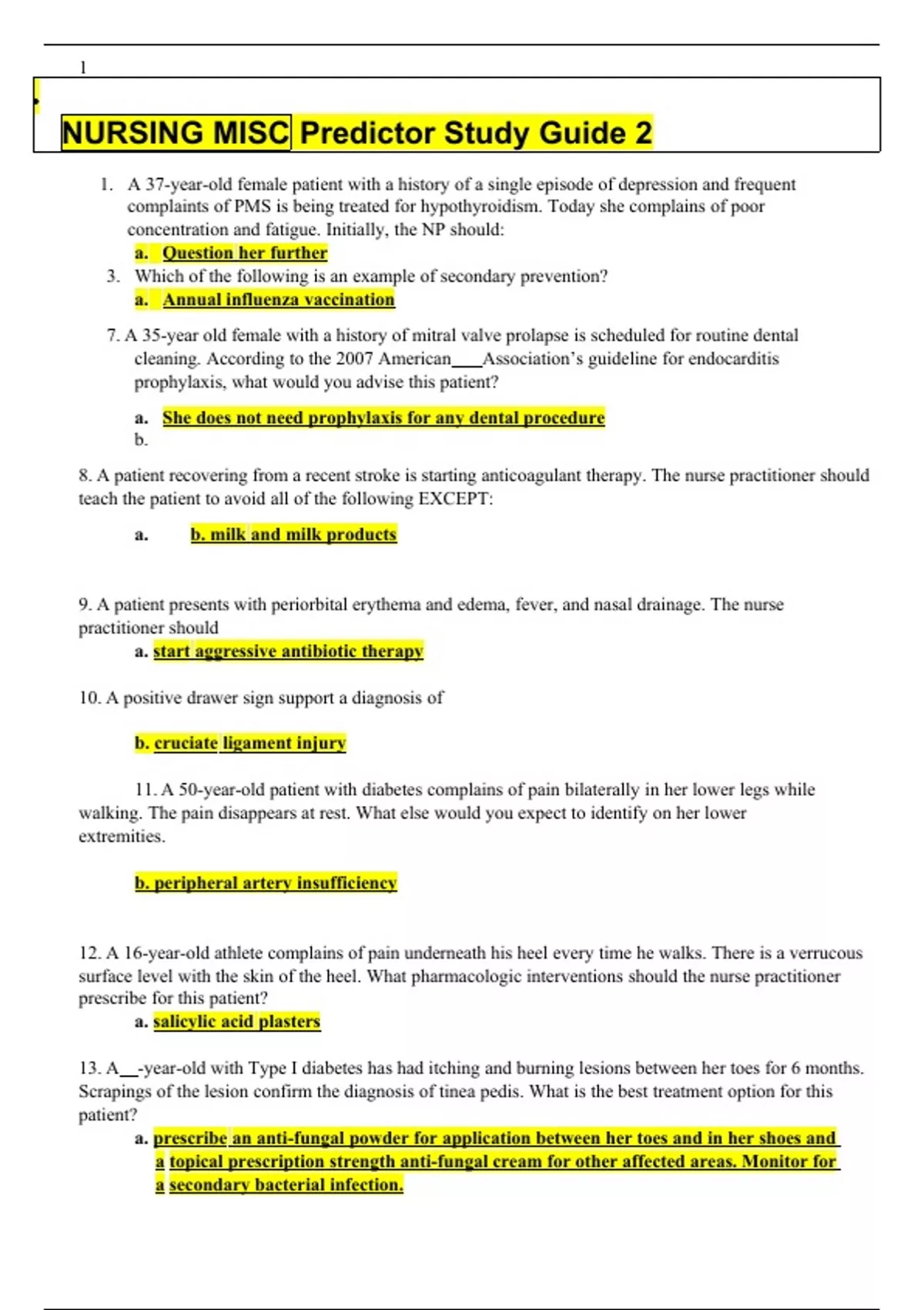 NURSING MISC Predictor Study Guide 2 1.A 37-year-old female patient with a history of a single episode of depression and frequent complaints of PMS is being treated for hypothyroidism. Today she complains of poor concentration and fatigue. Initially, the NP should: a.Question her further 3.Which of the following is an example of secondary prevention? a.Annual influenza vaccination 7.A 35-year old female with a history of mitral valve prolapse is scheduled for routine dental cleaning. According to the 2007 American Association’s guideline for endocarditis prophylaxis, what would you advise this patient? a.She does not need prophylaxis for any dental procedure b. 8.A patient recovering from a recent stroke is starting anticoagulant therapy. The nurse practitioner should teach the patient to avoid all of the following EXCEPT: a.b. milk and milk products 9.A patient presents with periorbital erythema and edema, fever, and nasal drainage. The nurse practitioner should aggressive antibiotic therapy 10.A positive drawer sign support a diagnosis of ate ligament injury 11.A 50-year-old patient with diabetes complains of pain bilaterally in her lower legs while walking. The pain disappears at rest. What else would you expect to identify on her lower extremities. b. peripheral artery insufficiency 12.A 16-year-old athlete complains of pain underneath his heel every time he walks. There is a verrucous surface level with the skin of the heel. What pharmacologic interventions should the nurse practitioner prescribe for this patient? ylic acid plasters 13.A -year-old with Type I diabetes has had itching and burning lesions between her toes for 6 months. Scrapings of the lesion confirm the diagnosis of tinea pedis. What is the best treatment option for this patient? ribe an anti-fungal powder for application between her toes and in her shoes and a topical prescription strength anti-fungal cream for other affected areas. Monitor for a secondary bacterial infection. c. Prescribe an oral anti-fungal for 4 to 12 weeks. Monitor liver enzymes, BUN and creatinine at one week, 2 weeks, and every month thereafter. d. Prescribe a prescription strength antifungal/steroid combination cream. Monitor for a secondary bacterial infection. 14.What is an appropriate drug for prophylactic treatment of migraine headaches in a 21-year-old female? a.Sumatriptan (Imitrex) b. propranolol (Inderal) c. ibuprofen (Motrin) d. dihydroergotamine (DHE) 15.Which of the following are the classic features of ulcerative colitis? a.RLQ pain, frequently accompanied by a palpable mass, fever, and leukopenia b.Massive painful hematemesis, occasionally accompanied by melena c.Rapidly progressive dysphagia to solid foods, anoriexia, and weight loss out of proportion to the dysphagia d.Remission and exacerbations of bloody diarrhea, tenesmus, fecal incontinence, abdominal pain, and . 16.Which drugs below would be expected to produce the least amount of hypokalemia? a.Furosemide (Lasix) chlorothiazide (HCTZ) and spironolactone (Aldactone) c.Spironolactone (Aldactone) chlorothiazide (HCTZ) 17.What information should patients with diabetes and their families receive about hypoglycemia? a.Hypoglycemia is very rare b.Hypoglycemia requires professional medical treatment c.Hypoglycemia is serious, dangerous, and can be fatal if not treated quickly d.Hypoglycemia occurs only as a result of overdose of insulin 18.A 60-year-old male patient with a past history of glaucoma and frequent sinusitis presents today with hypertension. On his last 2 visits to the clinic his blood pressures were 150-160/90-98. The nurse practitioner decides to treat the hypertension with long-acting propranolol (Inderal). Before prescribing it, the nurse practitioner should ask: er he smokes or consumes alcohol on a daily basis other medications have been prescribed for him he takes a daily antihistamine other family members are hypertensive 19.Which of the following is NOT associated with Type 2 diabetes mellitus? a.Gestational diabetes, birth of a macrosomic infant b.Hispanic, African-American, or Native American descent c.Alcohol or other drug abuse d.Obesity, hypertension, hypertriglyceridemia 20.A 35-year-old male presents with a severe unilateral headache over his left eye. He says it started about one hour ago and has rapidly gotten worse. He gives a history of similar headaches over the past 2 years. Physical examination is negative except for left eye lacrimation. What is the most likely diagnosis? c. Cluster headache d. Classic migraine headache 21.A 16-year-old sexually active female present to the clinic. She has never had vaccination for hepatitis A or B, she has had one MMR immunization, and her last tetanus vaccination was 4 years ago. Which vaccination would be contraindicated without further testing? c. MMR 22.A 15-year-old male presents with abdominal pain that began in the peri-umbilical area then localized to the right lower quadrant. He complains of nausea, vomiting, anorexia, and low-grade fever. A complete blood count (CBC) reveals moderate leukocytosis. What is the most likely diagnosis? d. Acute appendicitis 23.A 25-year-old hypertensive patient has a BMI of 16. His blood pressure is 165/100. There is an audible bruit in his left upper abdominal quadrant. He probably has: a.Essential hypertension b.Secondary hypertension 24.Which of the following is the most common presenting sign of substance abuse in adolescents? d. changes in behavior 25.Therapeutic international normalized ratio (INR) for a patient takein warfarin (Coumadin) for chronic atrial fibrillation is expected to be ased 26.A 199-year-old female reports that she is having “panic attacks.” The NP knows that panic attacks are characterized by d. sudden onset of intense fear or terror 27.A 25-year-old complains of fever and throat pain. The tonsils have exudate bilaterally. The patient describes having an anaphylactic reaction to penicillin in the past. What antibiotic should the NP prescri
