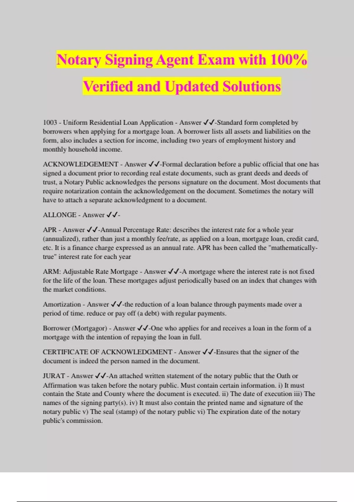 Notary Signing Agent Exam with 100% Verified and Updated Solutions 1003 - Uniform Residential Loan Application - Answer ️️ -Standard form completed by borrowers when applying for a mortgage loan. A borrower lists all assets and liabilities on the form, also includes a section for income, including two years of employment history and monthly household income. ACKNOWLEDGEMENT - Answer ️️ -Formal declaration before a public official that one has signed a document prior to recording real estate documents, such as grant deeds and deeds of trust, a Notary Public acknowledges the persons signature on the document. Most documents that require notarization contain the acknowledgement on the document. Sometimes the notary will have to attach a separate acknowledgment to a document. ALLONGE - Answer ️️ - APR - Answer ️️ -Annual Percentage Rate: describes the interest rate for a whole year (annualized), rather than just a monthly fee/rate, as applied on a loan, mortgage loan, credit card, etc. It is a finance charge expressed as an annual rate. APR has been called the "mathematically- true" interest rate for each year ARM: Adjustable Rate Mortgage - Answer ️️ -A mortgage where the interest rate is not fixed for the life of the loan. These mortgages adjust periodically based on an index that changes with the market conditions. Amortization - Answer ️️ -the reduction of a loan balance through payments made over a period of time. reduce or pay off (a debt) with regular payments. Borrower (Mortgagor) - Answer ️️ -One who applies for and receives a loan in the form of a mortgage with the intention of repaying the loan in full. CERTIFICATE OF ACKNOWLEDGMENT - Answer ️️ -Ensures that the signer of the document is indeed the person named in the document. JURAT - Answer ️️ -An attached written statement of the notary public that the Oath or Affirmation was taken before the notary public. Must contain certain information. i) It must contain the State and County where the document is executed. ii) The date of execution iii) The names of the signing party(s). iv) It must also contain the printed name and signature of the notary public v) The seal (stamp) of the notary public vi) The expiration date of the notary public's commission. OATH - Answer ️️ -A promise that one is making a true and correct statement to the best of their knowledge. i) Ask the signer to attest to the truth of the information given.( Accuracy) ii) Ask the signer to attest to the truthfulness of who they are. (Identity) iii) Ask the signer to attest that they did not make any false statements (Truth) AFFIRMATION - Answer ️️ -An oral or written declaration made by a person who has an objection to taking Oaths, certifying under the penalty of perjury the declarations are true. CONTENTS i) They must contain the State and County where the document is executed. ii) The date of execution iii) The names of the signing party(s). iv) It must also contain the printed name and signature of the notary public v) The seal (stamp) of the notary public vi) The expiration date of the notary public's commission. Typical Oath - Answer ️️ -"Do you solemnly swear that any statements made when signing this document are TRUE to the best of your knowledge and belief so help me God?" Typical Affirmation - Answer ️️ -"Do you solemnly, sincerely and truly declare and affirm that the statements in this document are true and accurate to the best of your knowledge and belief, and this you do under the penalties of
