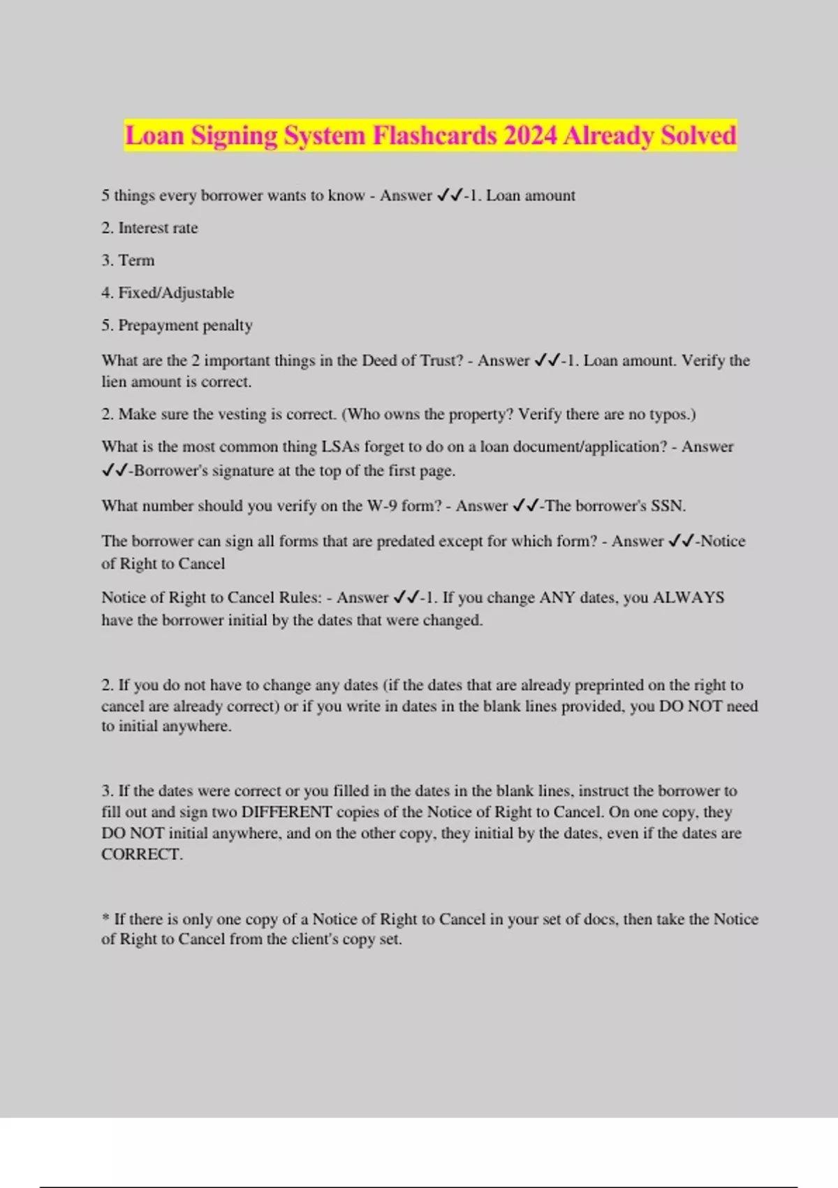 Loan Signing System Flashcards 2024 Already Solved 5 things every borrower wants to know - Answer ️️ -1. Loan amount 2. Interest rate 3. Term 4. Fixed/Adjustable 5. Prepayment penalty What are the 2 important things in the Deed of Trust? - Answer ️️ -1. Loan amount. Verify the lien amount is correct. 2. Make sure the vesting is correct. (Who owns the property? Verify there are no typos.) What is the most common thing LSAs forget to do on a loan document/application? - Answer ️️ -Borrower's signature at the top of the first page. What number should you verify on the W-9 form? - Answer ️️ -The borrower's SSN.
