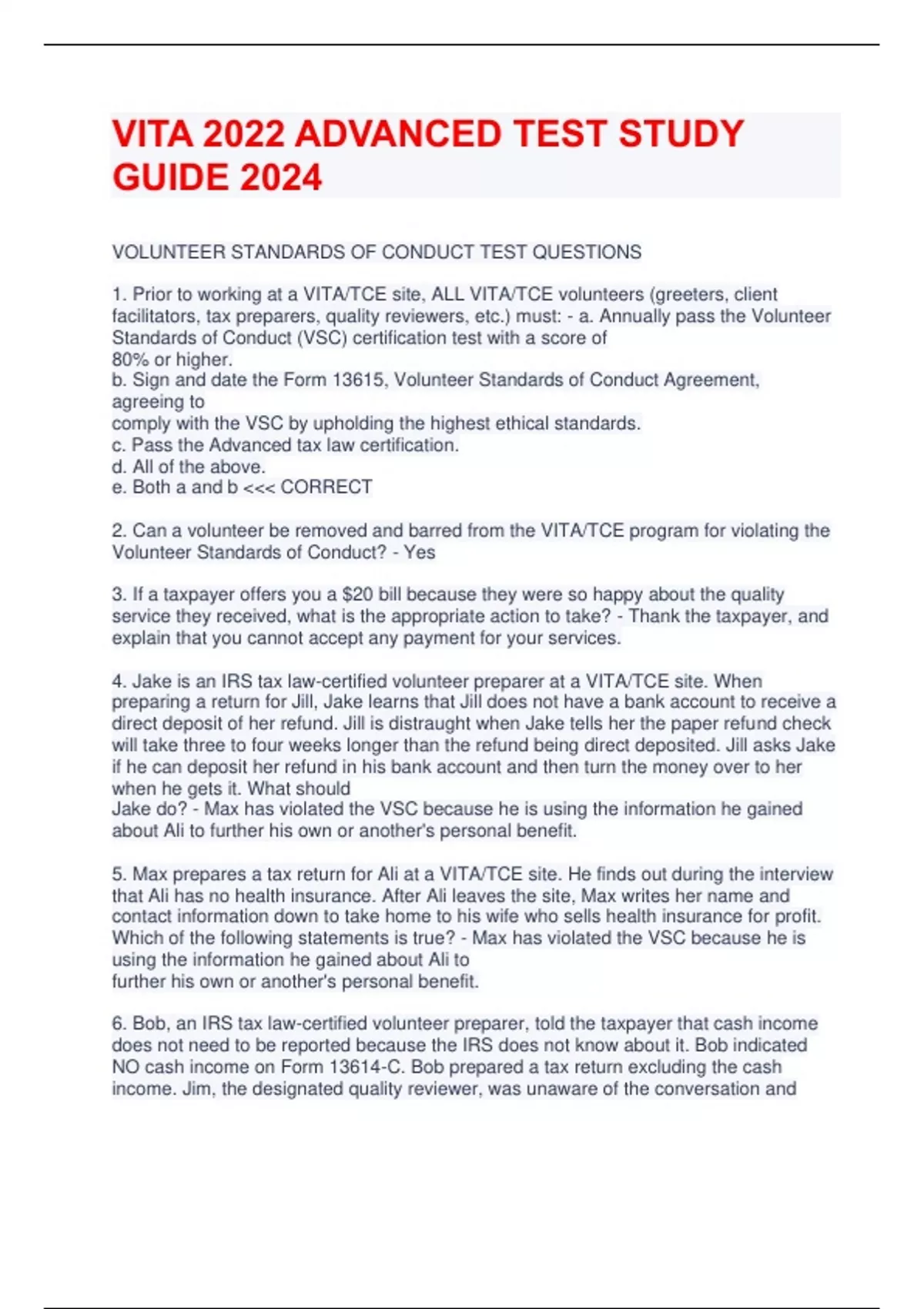 VOLUNTEER STANDARDS OF CONDUCT TEST QUESTIONS 1. Prior to working at a VITA/TCE site, ALL VITA/TCE volunteers (greeters, client facilitators, tax preparers, quality reviewers, etc.) must: - a. Annually pass the Volunteer Standards of Conduct (VSC) certification test with a score of 80% or higher. b. Sign and date the Form 13615, Volunteer Standards of Conduct Agreement, agreeing to comply with the VSC by upholding the highest ethical standards. c. Pass the Advanced tax law certification. d. All of the above. e. Both a and b <<< CORRECT 2. Can a volunteer be removed and barred from the VITA/TCE program for violating the Volunteer Standards of Conduct? - Yes 3. If a taxpayer offers you a $20 bill because they were so happy about the quality service they received, what is the appropriate action to take? - Thank the taxpayer, and explain that you cannot accept any payment for your services. 4. Jake is an IRS tax law-certified volunteer preparer at a VITA/TCE site. When preparing a return for Jill, Jake learns that Jill does not have a bank account to receive a direct deposit of her refund. Jill is distraught when Jake tells her the paper refund check will take three to four weeks longer than the refund being direct deposited. Jill asks Jake if he can deposit her refund in his bank account and then turn the money over to her when he gets it. What should Jake do? - Max has violated the VSC because he is using the information he gained about Ali to further his own or another's personal benefit. 5. Max prepares a tax return for Ali at a VITA/TCE site. He finds out during the interview that Ali has no health insurance. After Ali leaves the site, Max writes her name and contact information down to take home to his wife who sells health insurance for profit. Which of the following statements is true? - Max has violated the VSC because he is using the information he gained about Ali to further his own or another's personal benefit. 6. Bob, an IRS tax law-certified volunteer preparer, told the taxpayer that cash income does not need to be reported because the IRS does not know about it. Bob indicated NO cash income on Form 13614-C. Bob prepared a tax return excluding the cash income. Jim, the designated quality reviewer, was unaware of the conversation and therefore unaware of the cash income and the return was printed, signed, and e-filed. Who violated the Volunteer Standards of Conduct? - Bob, the tax law-certified volunteer who prepared the return. 7. Sue, a VITA/TCE coordinator, was watching the local news when she saw Aaron, a new tax law-certified volunteer, in a story about several bank employees being arrested for suspicion of embezzlement. She saw Aaron being led out of the bank in handcuffs. Three days later, Sue is shocked when she sees Aaron show up at the site ready to volunteer, apparently out on bond. She pulls Aaron aside and explains that his arrest on suspicion of embezzlement could have a negative effect on the site and therefore she must ask him to leave the site. Sue removed his access to the software, she then uses the external referral process to report the details to SPEC headquarters by sending an email to . Did Sue take appropriate actions as the coordinator? - Yes 8. Heidi, a VSC-certified volunteer, is working at the intake station. As part of her duties, she is required to explain to the taxpayer what they are expected to do today as part of the return preparation process. What should Heidi tell them? - a. Form 13614-C, Intake/Interview & Quality Review Sheet, must be completed prior to having the return prepared. b. You will be interviewed by the return preparer and asked additional questions as needed. c. You need to participate in a quality review of your tax return by someone other than the return preparer. d. All of the above. <<< CORRECT 9. During the intake process, the volunteer should verify the taxpayer (and/or spouse, if applicable) has photo identification. Additionally, taxpayers must provide verification of taxpayer identification numbers (SSN or ITIN) for everyone listed on the tax return. - True 10. Mary, a VSC-certified greeter, reviews the taxpayer's completed Form 13614-C, page 2, to identify what potential volunteer certification level is needed for this tax return. Mary sees the taxpayer has checked the "yes" box indicating they have self-employment income and the certification level next to the question is (A). All other questions answered "yes" have a (B) certification. When Mary assigns the return to a tax preparer, what tax law certification level does the tax preparer need? - Advanced INTAKE / INTERVIEW AND QUALITY REVIEW TEST QUESTIONS 1. All IRS-certified volunteer preparers participating in the VITA/TCE programs must use Form 13614-C along with an effective interview for every return prepared at the site. - True 2. What should the certified volunteer preparer do before starting the tax return? - -Make sure all questions on Form 13614-C are answered