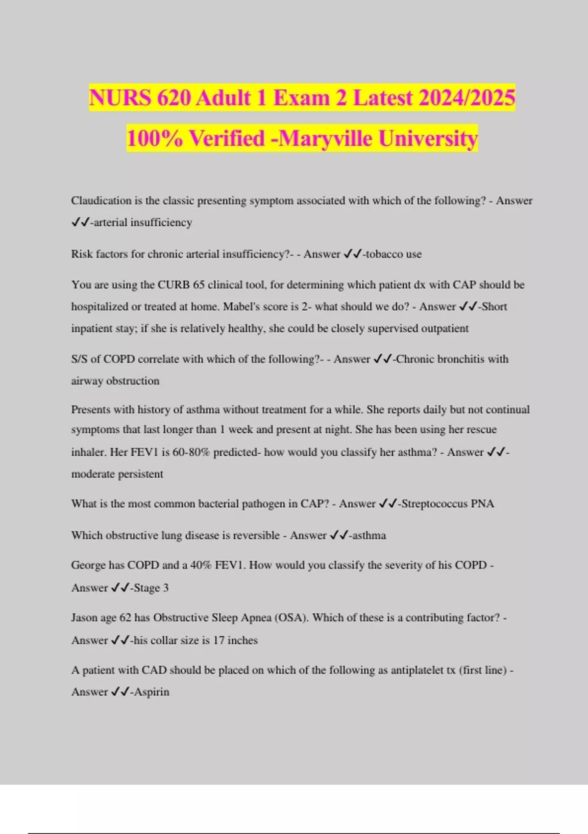 NURS 620 Adult 1 Exam 2 Latest 2024/2025 100% Verified -Maryville University