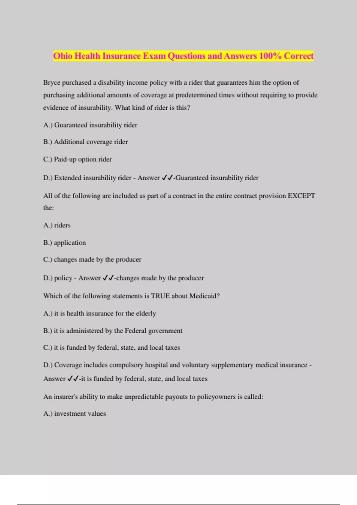 Ohio Health Insurance Exam Questions and Answers 100% Correct Bryce purchased a disability income policy with a rider that guarantees him the option of purchasing additional amounts of coverage at predetermined times without requiring to provide evidence of insurability. What kind of rider is this? A.) Guaranteed insurability rider B.) Additional coverage rider C.) Paid-up option rider D.) Extended insurability rider - Answer ️️ -Guaranteed insurability rider All of the following are included as part of a contract in the entire contract provision EXCEPT the: A.) riders B.) application C.) changes made by the producer D.) policy - Answer ️️ -changes made by the producer Which of the following statements is TRUE about Medicaid? A.) it is health insurance for the elderly B.) it is administered by the Federal government C.) it is funded by federal, state, and local taxes D.) Coverage includes compulsory hospital and voluntary supplementary medical insurance - Answer ️️ -it is funded by federal, state, and local taxes An insurer's ability to make unpredictable payouts to policyowners is called: A.) investment values B.) liquidity C.) assests D.) capital - Answer ️️ -liquidity Low frequency diseases can be exclusively covered by what kind of health insurance policies? A.) Limited policies B.) Blanket policies C.) Employer policies D.) Restricted policies - Answer ️️ -Limited policies Which of these is NOT considered a supplemental health insuring corporation (HIC) service? A.) outpatient medical services B.) foot care services C.) dental care D.) chiropractic care - Answer ️️ -outpatient medial services Which of the following would evidence ow