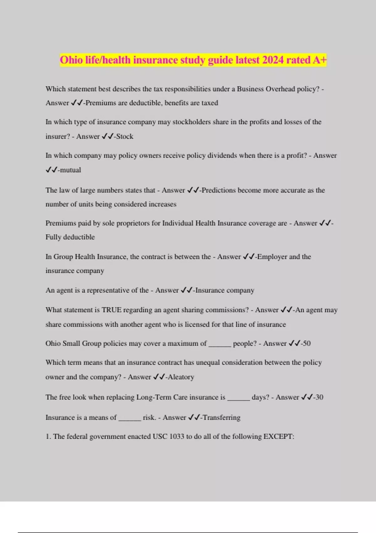 Ohio life/health insurance study guide latest 2024 rated A+ Which statement best describes the tax responsibilities under a Business Overhead policy? - Answer ️️ -Premiums are deductible, benefits are taxed In which type of insurance company may stockholders share in the profits and losses of the insurer? - Answer ️️ -Stock In which company may policy owners receive policy dividends when there is a profit? - Answer ️️ -mutual The law of large numbers states that - Answer ️️ -Predictions become more accurate as the number of units being considered increases Premiums paid by sole proprietors for Individual Health Insurance coverage are - Answer ️️ - Fully deductible In Group Health Insurance, the contract is between the - Answer ️️ -Employer and the insurance company An agent is a representative of the - Answer ️️ -Insurance company What statement is TRUE regarding an agent sharing commissions? - Answer ️️ -An agent may share commissions with another agent who is licensed for that line of insurance Ohio Small Group policies may cover a maximum of ______ people? - Answer ️️ -50 Which term means that an insurance contract has unequal consideration between the policy owner and the company? - Answer ️️ -Aleatory The free look when replacing Long-Term Care insurance is ______ days? - Answer ️️ -30 Insurance is a means of ______ risk. - Answer ️️ -Transferring 1. The federal government enacted USC 1033 to do all of the following EXCEPT: