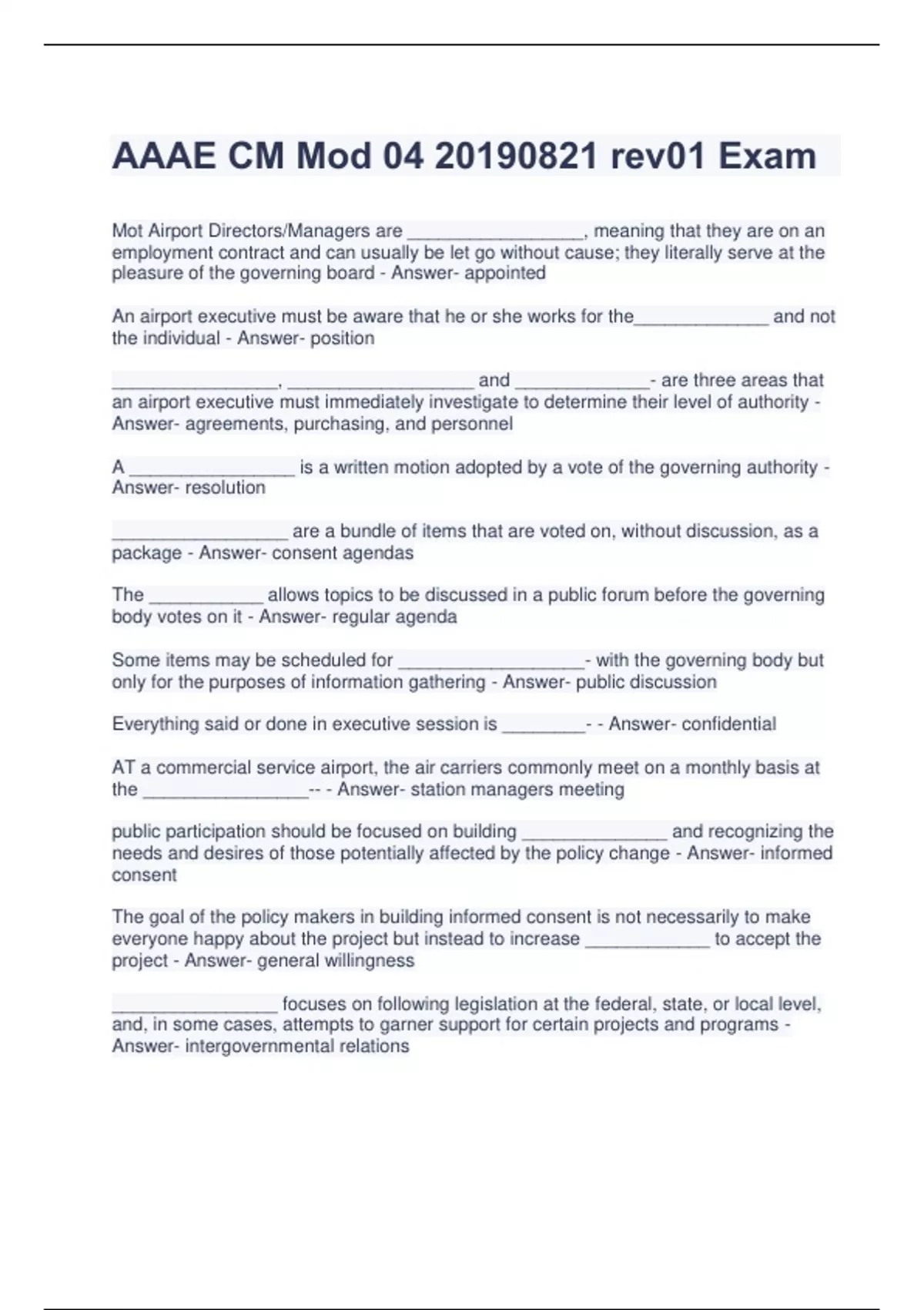 Mot Airport Directors/Managers are _________________, meaning that they are on an employment contract and can usually be let go without cause; they literally serve at the pleasure of the governing board - Answer- appointed An airport executive must be aware that he or she works for the_____________ and not the individual - Answer- position ________________, __________________ and _____________- are three areas that an airport executive must immediately investigate to determine their level of authority - Answer- agreements, purchasing, and personnel A ________________ is a written motion adopted by a vote of the governing authority - Answer- resolution _________________ are a bundle of items that are voted on, without discussion, as a package - Answer- consent agendas The ___________ allows topics to be discussed in a public forum before the governing body votes on it - Answer- regular agenda Some items may be scheduled for __________________- with the governing body but only for the purposes of information gathering - Answer- public discussion Everything said or done in executive session is ________- - Answer- confidential AT a commercial service airport, the air carriers commonly meet on a monthly basis at the ________________-- - Answer- station managers meeting public participation should be focused on building ______________ and recognizing the needs and desires of those potentially affected by the policy change - Answer- informed consent The goal of the policy makers in building informed consent is not necessarily to make everyone happy about the project but instead to increase ____________ to accept the project - Answer- general willingness ________________ focuses on following legislation at the federal, state, or local level, and, in some cases, attempts to garner support for certain projects and programs - Answer- intergovernmental relationsthe _________________ or role focuses on attending regional and economic development planning meetings, developing position papers on legislative and policy issues, representing the airport in regional forums with federal, state, and local government officials, and preparing talking points and presentations for board members and the airport executive - Answer- governmental affairs function an ___________ or _______________, such as a lobbyist, is often helpful in providing insight into the details of legislation and the legislative process - Answer- attorney or legislative specialist AAAE holds more than _____ domestic and international meetings each year with ___________ attendees - Answer- 90; 10,000 When AAAE members need assistance interpreting or advocating for a position on pending or existing legislation, the AAAE legislative affairs team --- _____________________ --- provides strong and effective representation for america's airport system on capitol hill. - Answer- airport legislative alliance _______________ keep members up to date on the status of pending legislation - Answer- airport alerts _________ provide insights into the various hearings that affect airport operators including TSA, FAA, and DHS testimony - Answer- hearing reports ______________ deliver timely information and updates to airport executives who need to be in the know on industry-related developments on capitol hill and around Washington. - Answer- Washington Insider Update Videos The transportation security policy (TSP) pro