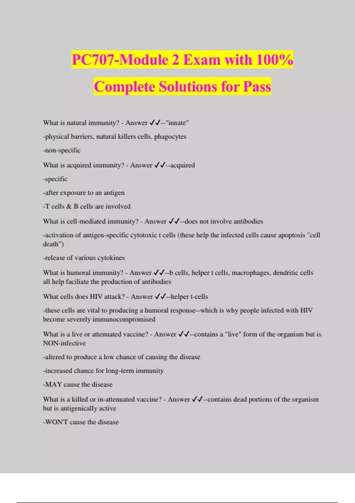 PC707-Module 2 Exam with 100% Complete Solutions for Pass What is natural immunity? - Answer ️️ --"innate" -physical barriers, natural killers cells, phagocytes -non-specific What is acquired immunity? - Answer ️️ --acquired -specific -after exposure to an antigen -T cells & B cells are involved What is cell-mediated immunity? - Answer ️️ --does not involve antibodies -activation of antigen-specific cytotoxic t cells (these help the infected cells cause apoptosis "cell death") -release of various cytokines What is humoral immunity? - Answer ️️ --b cells, helper t cells, macrophages, dendritic cells all help faciliate the production of antibodies What cells does HIV attack? - Answer ️️ --helper t-cells -these cells are vital to producing a humoral response--which is why people infected with HIV become severely immunocompromised What is a live or attenuated vaccine? - Answer ️️ --contains a "live" form of the organism but is NON-infective -altered to produce a low chance of causing the disease -increased chance for long-term immunity -MAY cause the disease What is a killed or in-attenuated vaccine? - Answer ️️ --contains dead portions of the organism but is antigenically active -WON'T cause the disease -protection is more short term -will need more boosters What are precautions with vaccinations? - Answer ️️ --temp greater than 105 within 48 hours of a vaccine -continuous crying greater than 3 hours -convulsions What are the contraindications for giving vaccinations? - Answer ️️ --true egg allergy-- "anaphylactic reactions" (those with mild egg reactions are ok) -no "live" vaccines in pregnancy -encephalopathy -experienced GBS (guillain barre syndrome) When is TDAP given in pregnancy? Why is this timing important? - Answer ️️ --27-36 weeks gestation -this is to ensure the mother has adequate time to develop antibodies in order to pass them on to the fetus AND for there to be adequate protection to the infant until they can get their routine DTaP vaccination -it is safe to be given sooner for extenuative circumstances such as a "whooping cough outbreak" or potential tetanus exposure Who should we consult for up-to-date evidence-based prescribing practices regarding flu vaccinations? - Answer ️️ --the CD