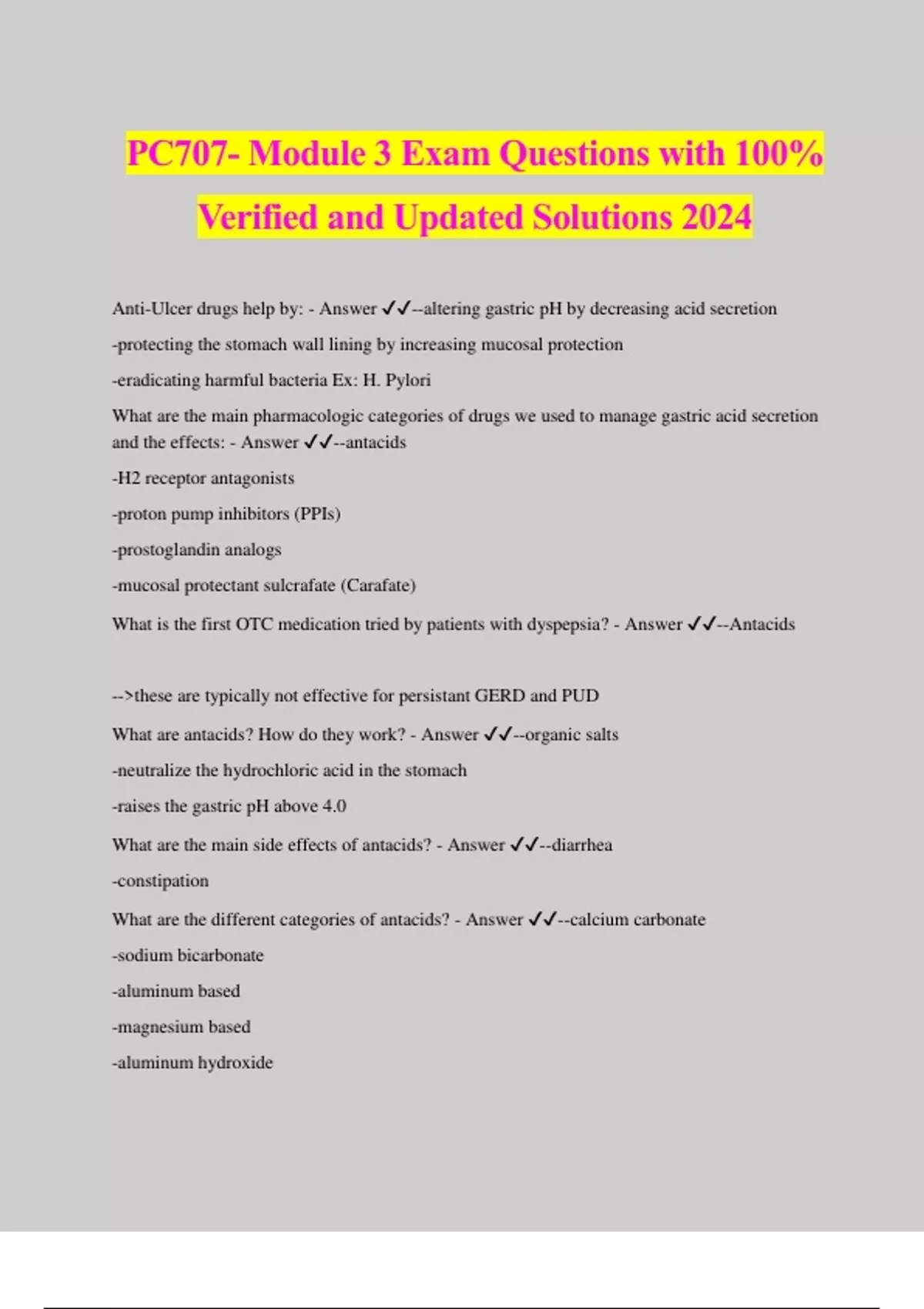 PC707- Module 3 Exam Questions with 100% Verified and Updated Solutions 2024 Anti-Ulcer drugs help by: - Answer ️️ --altering gastric pH by decreasing acid secretion -protecting the stomach wall lining by increasing mucosal protection -eradicating harmful bacteria Ex: H. Pylori What are the main pharmacologic categories of drugs we used to manage gastric acid secretion and the effects: - Answer ️️ --antacids -H2 receptor antagonists -proton pump inhibitors (PPIs) -prostoglandin analogs -mucosal protectant sulcrafate (Carafate) What is the first OTC medication tried by patients with dyspepsia? - Answer ️️ --Antacids -->these are typically not effective for persistant GERD and PUD What are antacids? How do they work? - Answer ️️ --organic salts -neutralize the hydrochloric acid in the stomach -raises the gastric pH above 4.0 What are the main side effects of antacids? - Answer ️️ --diarrhea -constipation What are the different categories of antacids? - Answer ️️ --calcium carbonate -sodium bicarbonate -aluminum based -magnesium based -aluminum hydroxide What is important teaching for patients taking antacids? - Answer ️️ --decreasing the stomach pH can cause the decrease absorption of drugs that rely on acidic conditions -if taking enteric coated medications--reducing stomach acid can cause the medication to dissolve and absorb in the stomach instead of the intestine **always separate antacids from other medications by 2 hours** Calcium carbonate antacids: - Answer ️️ --Tums -can cause CONSTIPATION -require adequate fluid intake to dissolve -can be used in patients needing to take an antacid who also could benefit from extra calcium intake. -potential for milk "alkali" syndrome, metabolic alkalosis Sodium Bicarbonate antacids: - Answer ️️ --Alka Seltzer -contains aspirin (ASA) -potential to WORSEN GI distress. -increased risk for water retention and fluid overload -potential to cause hypertension -Contraindicated in pregnancy, children, patient with CVD* Aluminum based antacids: - Answer ️️ --Amphogel -can cause CONSTIPATION -requires adequate fluid intake to dissolve -Contraindicated in patients with renal insufficiency* Magnesium based antacids: - Answer ️️ --Milk of magnesia -suspension mixture is more effective -can cause DIARRHEA -Contraindicated in renal insufficiency* Aluminum hydroxide antacids: - Answer ️️ --may decrease the absorption of warfarin*. -can cause a chelating affect with drugs such as tetracyclines, warfarin, and digoxin—potentially decreasing their absorption & effectiveness -high affinity for phosphate—may cause hypophasphatemia What can cause heartburn in pregnancy? - Answer ️️ --hormonal fluctuations -anatomic chang