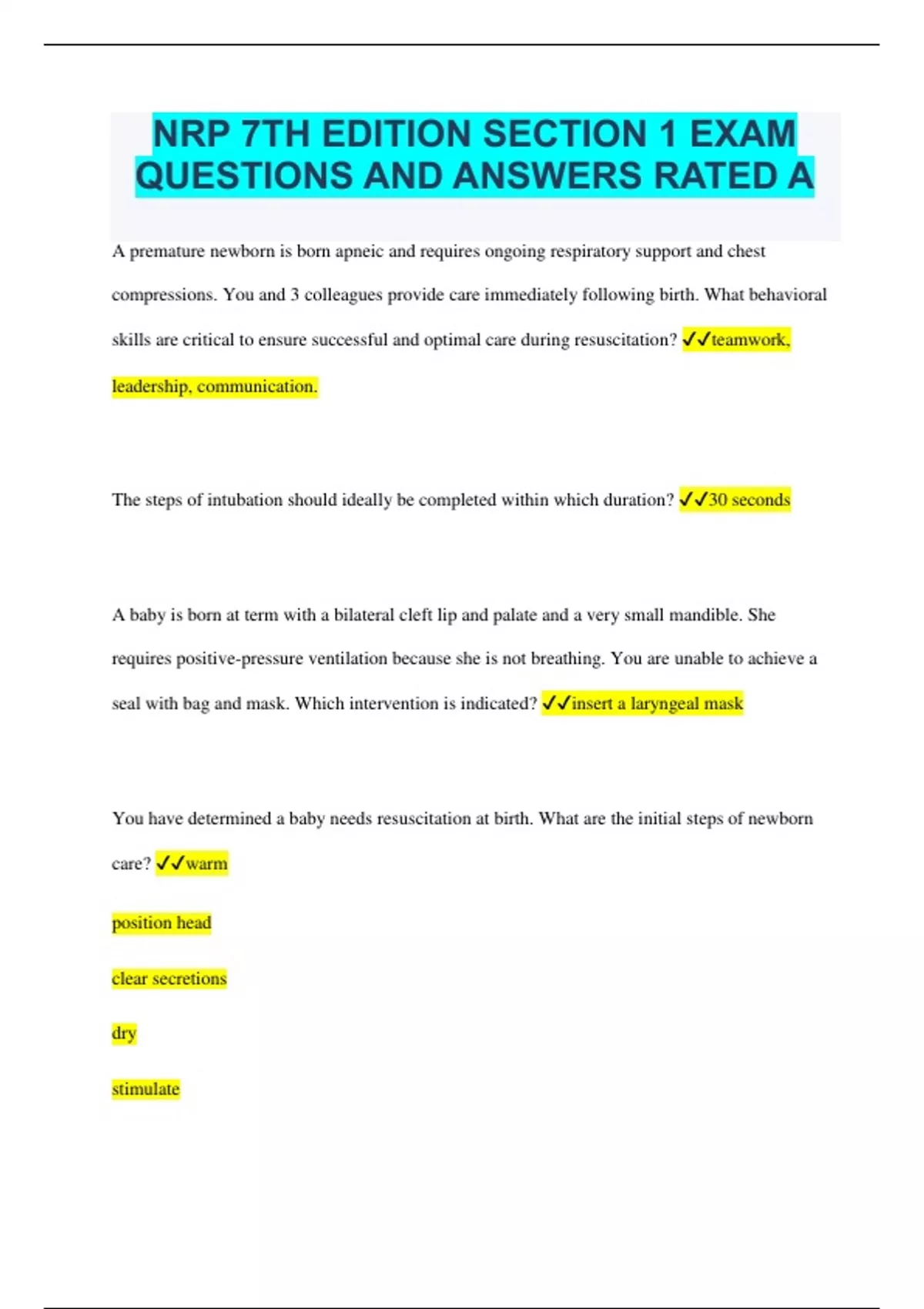 NRP 7TH EDITION SECTION 1 EXAM QUESTIONS AND ANSWERS RATED A