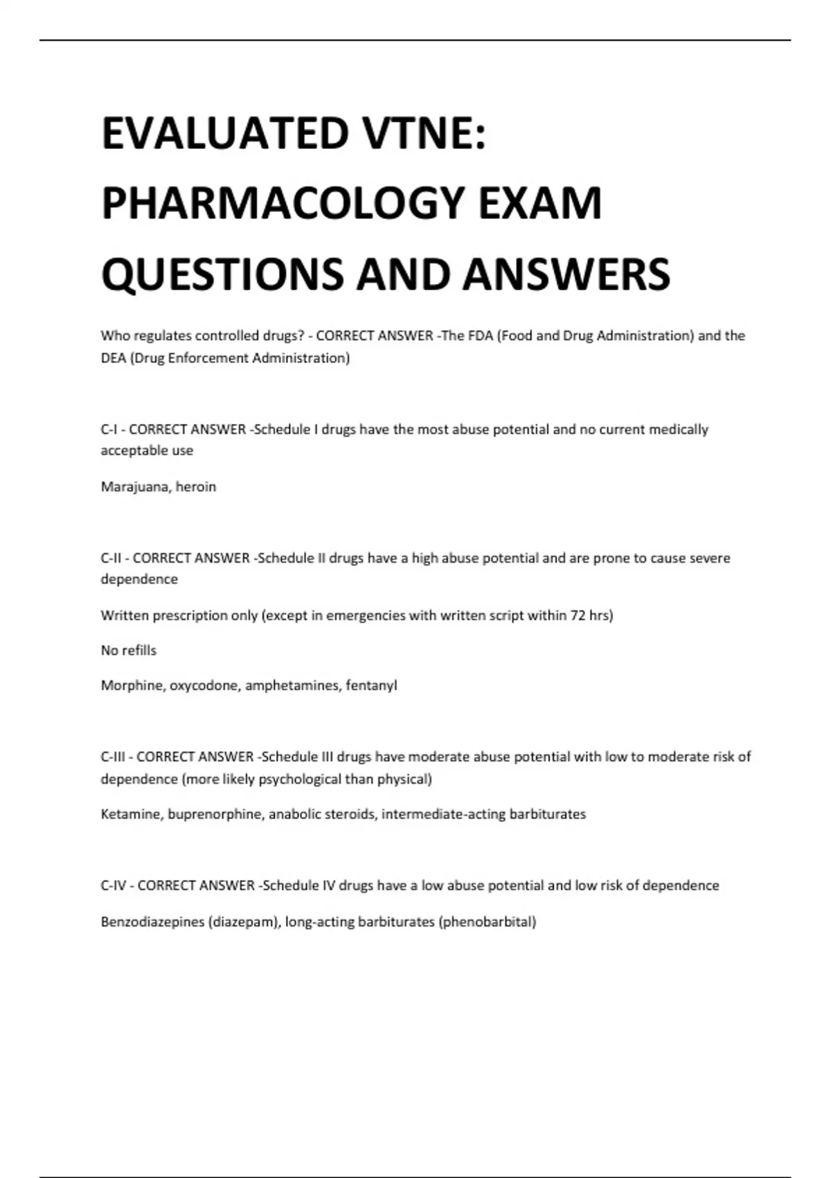 EVALUATED VTNE: PHARMACOLOGY EXAM QUESTIONS AND ANSWERS Who regulates controlled drugs? - CORRECT ANSWER -The FDA (Food and Drug Administration) and the DEA (Drug Enforcement Administration) C-I - CORRECT ANSWER -Schedule I drugs have the most abuse potential and no current medically acceptable use Marajuana, heroin C-II - CORRECT ANSWER -Schedule II drugs have a high abuse potential and are prone to cause severe dependence Written prescription only (except in emergencies with written script within 72 hrs) No refills Morphine, oxycodone, amphetamines, fentanyl C-III - CORRECT ANSWER -Schedule III drugs have moderate abuse potential with low to moderate risk of dependence (more likely psychological than physical) Ketamine, buprenorphine, anabolic steroids, intermediate-acting barbiturates C-IV - CORRECT ANSWER -Schedule IV drugs have a low abuse potential and low risk of dependence Benzodiazepines (diazepam), long-acting barbiturates (phenobarbital) C-V - CORRECT ANSWER -Schedule V drugs have the lowest risk of abuse or dependence of the scheduled drugs Compounded drug - CORRECT ANSWER -One that has been manipulated in a way that is not provided for in an FDA approved drug label Five "rights" of drug administration - CORRECT ANSWER -Right drug Right amount Right route Right time Right patient Therapeutic index (TI) - CORRECT ANSWER -Comparison between a drug's ability to reach the desired effect and its tendency to produce toxic effects TI = LD50/ED50 The larger the number, the safer the drug LD50 - CORRECT ANSWER -The dose of a drug that is lethal in 50% of the animals in a trial ED50 - CORRECT ANSWER -The dose of a drug that is effective in 50% of the animals in a trial Blood-brain barrier - CORRECT ANSWER -A mechanism that prevents some substances in the blood from reaching the brain. It is achieved by brain capillaries, which unlike other capillaries elsewhere in the body, are composed of endothelial cells sealed together in continuous tight junctions and surrounded by astrocytes that contribute to the selective passage of substances. Lipid-soluble substances such as alcohol, caffeine, nicotine and most anaesthetics, as well as glucose, oxygen and water, pass rapidly into brain cells, whereas proteins, most antibiotics and ions do not enter or enter very slowly. The mechanism protects brain cells against harmful substances and pathogens.