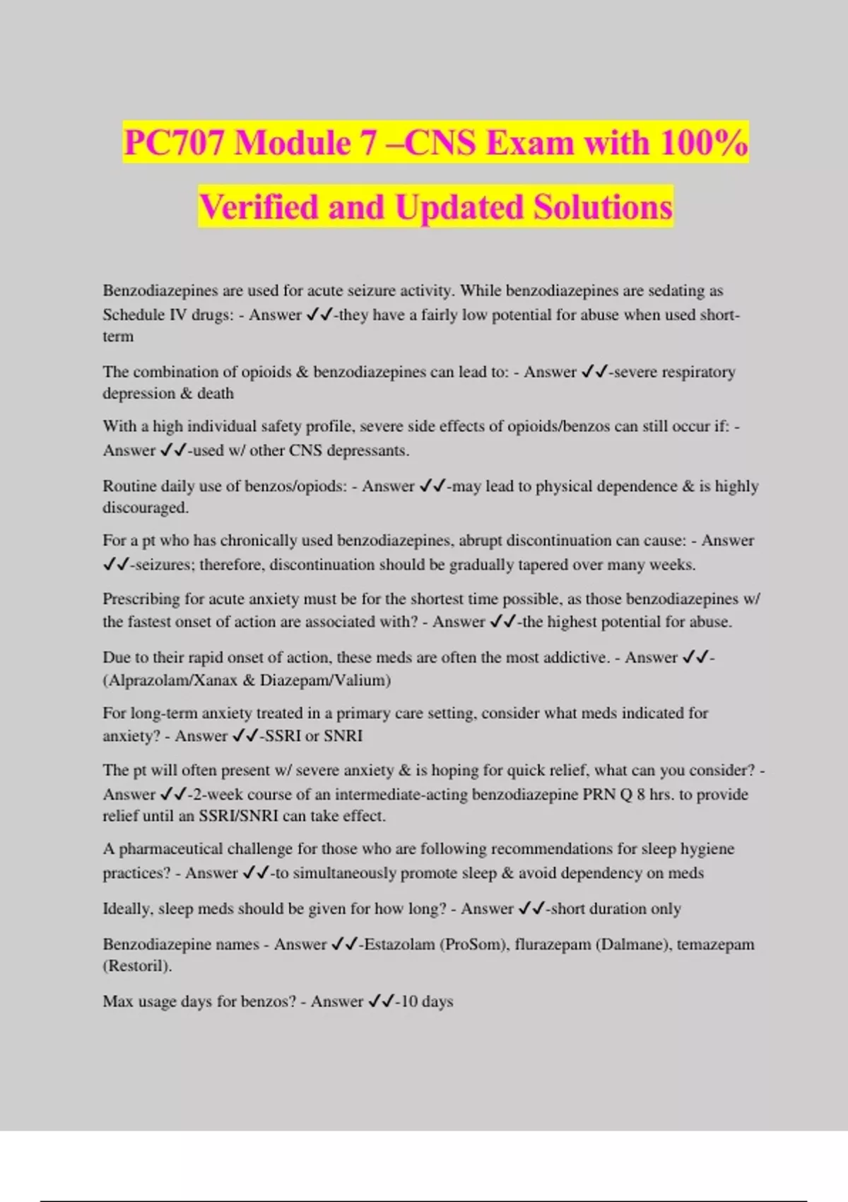 PC707 Module 7 –CNS Exam with 100% Verified and Updated Solutions Benzodiazepines are used for acute seizure activity. While benzodiazepines are sedating as Schedule IV drugs: - Answer ️️ -they have a fairly low potential for abuse when used short- term The combination of opioids & benzodiazepines can lead to: - Answer ️️ -severe respiratory depression & death With a high individual safety profile, severe side effects of opioids/benzos can still occur if: - Answer ️️ -used w/ other CNS depressants. Routine daily use of benzos/opiods: - Answer ️️ -may lead to physical dependence & is highly discouraged. For a pt who has chronically used benzodiazepines, abrupt discontinuation can cause: - Answer ️️ -seizures; therefore, discontinuation should be gradually tapered over many weeks. Prescribing for acute anxiety must be for the shortest time possible, as those benzodiazepines w/ the fastest onset of action are associated with? - Answer ️️ -the highest potential for abuse. Due to their rapid onset of action, these meds are often the most addictive. - Answer ️️ - (Alprazolam/Xanax & Diazepam/Valium) For long-term anxiety treated in a primary care setting, consider what meds indicated for anxiety? - Answer ️️ -SSRI or SNRI The pt will often present w/ severe anxiety & is hoping for quick relief, what can you consider? - Answer ️️ -2-week course of an intermediate-acting benzodiazepine PRN Q 8 hrs. to provide relief until an SSRI/SNRI can take effect. A pharmaceutical challenge for those who are following recommendations for sleep hygiene practices? - Answer ️️ -to simultaneously promote sleep & avoid dependency on meds Ideally, sleep meds should be given for how long? - Answer ️️ -short duration only Benzodiazepine names - Answer ️️ -Estazolam (ProSom), flurazepam (Dalmane), temazepam (Restoril). Max usage days for benzos? - Answer ️️ -10 days