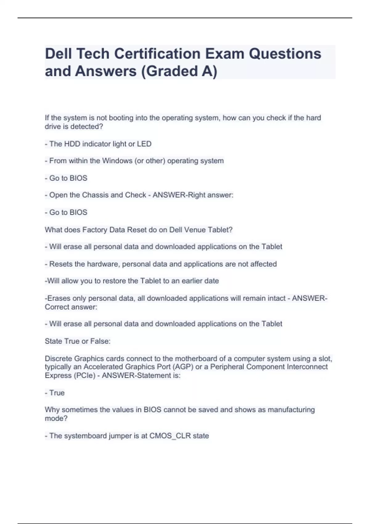 Dell Tech Certification Exam Questions and Answers (Graded A)Dell Tech Certification Exam Questions and Answers (Graded A)Dell Tech Certification Exam Questions and Answers (Graded A)If the system is not booting into the operating system, how can you check if the hard drive is detected? - The HDD indicator light or LED - From within the Windows (or other) operating system - Go to BIOS - Open the Chassis and Check - ANSWER-Right answer: - Go to BIOS What does Factory Data Reset do on Dell Venue Tablet? - Will erase all personal data and downloaded applications on the Tablet
