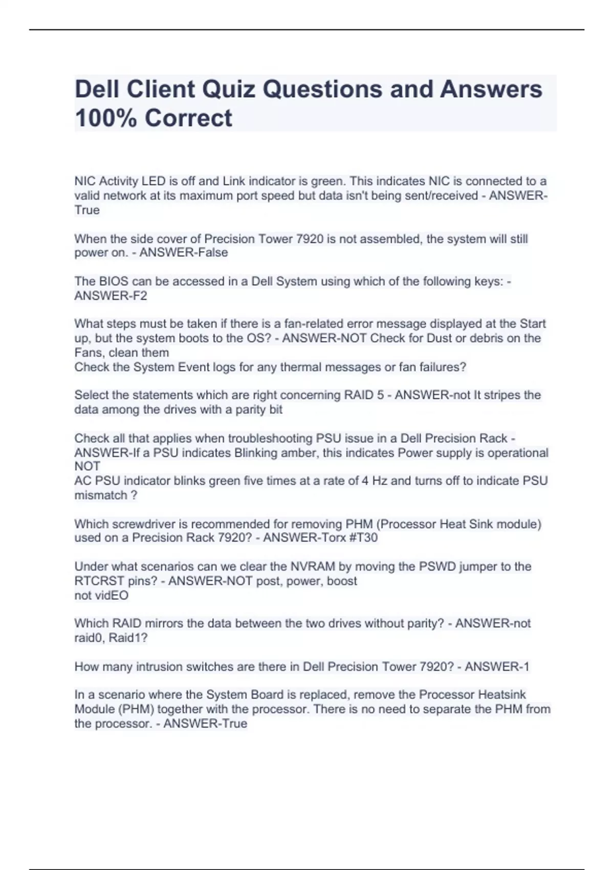 Dell Client Quiz Questions and Answers 100% Correct Dell Client Quiz Questions and Answers 100% Correct Dell Client Quiz Questions and Answers 100% Correct NIC Activity LED is off and Link indicator is green. This indicates NIC is connected to a valid network at its maximum port speed but data isn't being sent/received - ANSWER-True When the side cover of Precision Tower 7920 is not assembled, the system will still power on. - ANSWER-False The BIOS can be accessed in a Dell System using which of the following keys: - ANSWER-F2 What steps must be taken if there is a fan-related error message displayed at the Start up, but the system boots to the OS? - ANSWER-NOT Check for Dust or debris on the Fans, clean them Check the System Event logs for any thermal messages or fan failures? Select the statements which are right concerning RAID 5 - ANSWER-not It stripes the