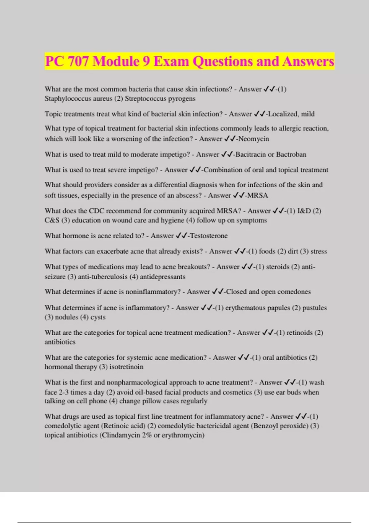 PC 707 Module 9 Exam Questions and Answers What are the most common bacteria that cause skin infections? - Answer ️️ -(1) Staphylococcus aureus (2) Streptococcus pyrogens Topic treatments treat what kind of bacterial skin infection? - Answer ️️ -Localized, mild What type of topical treatment for bacterial skin infections commonly leads to allergic reaction, which will look like a worsening of the infection? - Answer ️️ -Neomycin What is used to treat mild to moderate impetigo? - Answer ️️ -Bacitracin or Bactroban What is used to treat severe impetigo? - Answer ️️ -Combination of oral and topical treatment What should providers consider as a differential diagnosis when for infections of the skin and soft tissues, especially in the presence of an abscess? - Answer ️️ -MRSA What does the CDC recommend for community acquired MRSA? - Answer ️️ -(1) I&D (2) C&S (3) education on wound care and hygiene (4) follow up on symptoms What hormone is acne related to? - Answer ️️ -Testosterone What factors can exacerbate acne that already exists? - Answer ️️ -(1) foods (2) dirt (3) stress What types of medications may lead to acne breakouts? - Answer ️️ -(1) steroids (2) anti- seizure (3) anti-tuberculosis (4) antidepressants What determines if acne is noninflammatory? - Answer ️️ -Closed and open comedones What determines if acne is inflammatory? - Answer ️️ -(1) erythematous papules (2) pustules (3) nodules (4) cysts What are the categories for topical acne treatment medication? - Answer ️️ -(1) retinoids (2) antibiotics What are the categories for systemic acne medication? - Answer ️️ -(1) oral antibiotics (2) hormonal therapy (3) isotretinoin What is the first and nonpharmacological approach to acne treatment? - Answer ️️ -(1) wash face 2-3 times a day (2) avoid oil-based facial products and cosmetics (3) use ear buds when talking on cell phone (4) change pillow cases regularly What drugs are used as topical first line treatment for inflammatory acne? - Answer ️️ -(1) comedolytic agent (Retinoic acid) (2) comedolytic bactericidal agent (Benzoyl peroxide) (3) topical antibiotics (Clindamycin 2% or erythromycin) What do you combine topical antibiotics with during acne treatment to prevent antibacterial resistance? - Answer ️️ -Benzoyl peroxide For second line treatment of acne, what systemic antibiotics are commonly used? - Answer ️️ - (1) tetracyclines (2) clindamycin (3) erythromycin What antibiotic for acne is recommended if tetracycline does not work or if pregnancy is a possibility? - Answer ️️ -Erythromycin How long should you tell your patient to wait to see improvement in acne after starting treatment? - Answer ️️ -6 weeks What can be a second line treatment of acne for women of childbearing age? - Answer ️️ - Combined oral contraceptives What are COCs that are FDA approved for acne treatment? - Answer ️️ -(1) YAZ (2) Estrostep (3) Ortho Tri-cyclen What education is important for a patient on COCs? - Answer ️️ -ACHES criteria What would you tell a patient that has stopped taking COCs and says that her acne is cured? - Answer ️️ -SHBG remains in the system for several m