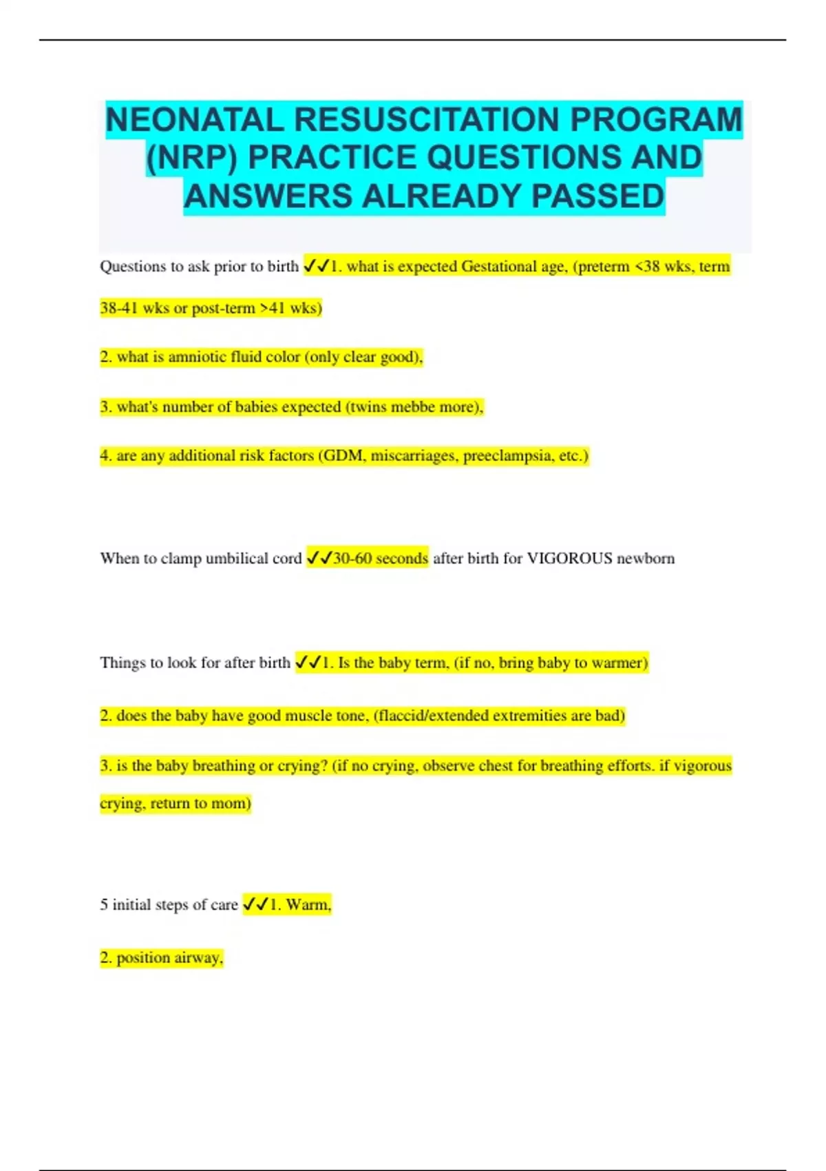 NEONATAL RESUSCITATION PROGRAM (NRP) PRACTICE QUESTIONS AND ANSWERS ALREADY PASSED