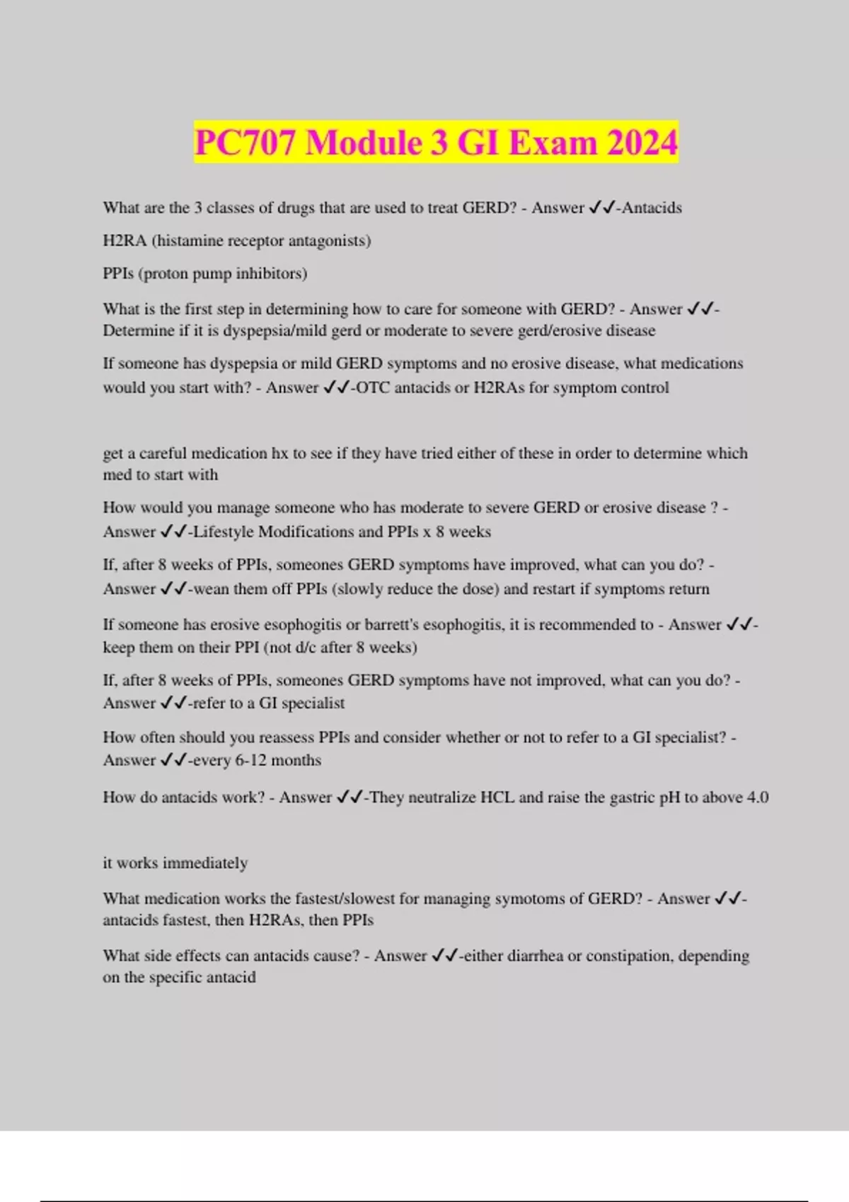 PC707 Module 3 GI Exam 2024 What are the 3 classes of drugs that are used to treat GERD? - Answer ️️ -Antacids H2RA (histamine receptor antagonists) PPIs (proton pump inhibitors) What is the first step in determining how to care for someone with GERD? - Answer ️️ - Determine if it is dyspepsia/mild gerd or moderate to severe gerd/erosive disease If someone has dyspepsia or mild GERD symptoms and no erosive disease, what medications would you start with? - Answer ️️ -OTC antacids or H2RAs for symptom control get a careful medication hx to see if they have tried either of these in order to determine which med to start with How would you manage someone who has moderate to severe GERD or erosive disease ? - Answer ️️ -Lifestyle Modifications and PPIs x 8 weeks If, after 8 weeks of PPIs, someones GERD symptoms have improved, what can you do? - Answer ️️ -wean them off PPIs (slowly reduce the dose) and restart if symptoms return If someone has erosive esophogitis or barrett's esophogitis, it is recommended to - Answer ️️ - keep them on their PPI (not d/c after 8 weeks) If, after 8 weeks of PPIs, someones GERD symptoms have not improved, what can you do? - Answer ️️ -refer to a GI specialist How often should you reassess PPIs and consider whether or not to refer to a GI specialist? - Answer ️️ -every 6-12 months How do antacids work? - Answer ️️ -They neutralize HCL and raise the gastric pH to above 4.0 it works immediately What medication works the fastest/slowest for managing symotoms of GERD? - Answer ️️ - antacids fastest, then H2RAs, then PPIs What side effects can antacids cause? - Answer ️️ -either diarrhea or constipation, depending on the specific antacid If someone is taking enteric drugs and antacids, what should you do? - Answer ️️ -separate by 2hrs b/c antacid changes the pH of the stomach, the enteric coated medication may release in the stomach instead of the intestines. you should separate other meds from antacids by _______ hrs - Answer ️️ -2, due to chelation and enteric coatings Calcium Carbonate (Tums, Rolaids) can cause - Answer ️️ -constipation Sodium bicarbonate antacids (Alka Seltzer) can cause - Answer ️️ -fluid retention Sodium bicarbonate antacids (Alka Seltzer) contain - Answer ️️ -aspirin Sodium bicarbonate antacids (Alka Seltzer) are not recommended for people with - Answer ️️ - HTN, fluid retention, CHF, pregnancy What antacid is contraindicated in pregnancy? - Answer ️️ -sodium bicarbonate antacids, due to the ASA Magnesium (Milk of Magnesia) can cause - Answer ️️ -diarrhea Do not prescribe magnesium for someone with - Answer ️️ -renal insufficienc