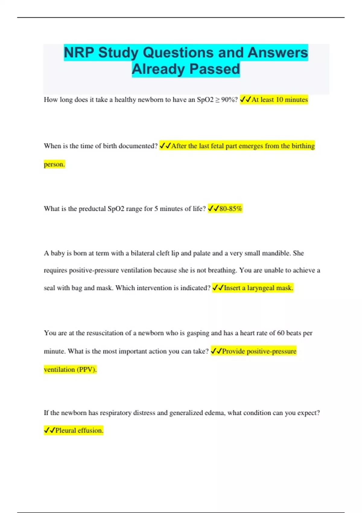 NRP Study Questions and Answers Already Passed How long does it take a healthy newborn to have an SpO2 ≥ 90%? At least 10 minutes When is the time of birth documented? After the last fetal part emerges from the birthing person. What is the preductal SpO2 range for 5 minutes of life? 80-85% A baby is born at term with a bilateral cleft lip and palate and a very small mandible. She requires positive-pressure ventilation because she is not breathing. You are unable to achieve a seal with bag and mask. Which intervention is indicated? Insert a laryngeal mask. You are at the resuscitation of a newborn who is gasping and has a heart rate of 60 beats per minute. What is the most important action you can take? Provide positive-pressure ventilation (PPV). If the newborn has respiratory distress and generalized edema, what condition can you expect? Pleural effusion. 1. What flow rate is used for free-flow O2 administration? 2. What % of O2 do you start at? 1. 10 L/min 2. Start at 30%, then titrate up to desired SpO2 target range. When clearing secretions, which do you clear first: mouth or nose? Mouth (M comes before N) What size (internal diameter) endotracheal tube should be used to intubate a newborn with an estimated gestational age of 26 weeks (estimated birth weight of 800 g)? 2.5 mm Your team attends an emergency cesarean delivery of a term baby because of chorioamnionitis, meconium-stained amniotic fluid, and fetal heart rate decelerations. At delivery, the newborn is term as expected, with very poor tone and he is not breathing (apneic). You quickly perform initial steps, but the newborn is still not breathing. What is the most appropriate next step of resuscitation? Start PPV and check heart rate response after 15 seconds During the resuscitation of a newborn, you auscultate the apical pulse and count 10 beats over a 6 second period. What heart rate do you report to your team? 100 bpm You are part of a team preparing for the birth of a baby who has meconium-stained fluid and a category III fetal heart rate tracing. A person skilled in endotracheal intubation should be: Present at birth. You are at a delivery of a baby born through meconium-stained amniotic fluid, and the baby is not vigorous. What steps should be taken immediately after birth? The baby should be brought to the radiant warmer for initial steps of newborn care. What is the most effective maneuver to establish spontaneous breathing in a baby that is apneic after initial steps? Administration of PPV that inflates the lungs What is the pre-ductal SpO2 range for 3 minutes of life? 70-75% If a heart rate is 9 beats in 6 seconds, how fast is the heart rate? 90 bpm Which O2 PPV resuscitator: - Requires a compressed gas source - Must have a tight seal to inflate - Use a flow-control valve to regulate the PIP and PEEP - Can deliver free-flow O2 via mask - Can deliver CPAP to a spontaneously breathing newborn Flow-inflating bag What is the pre-ductal SpO2 range for 2 minutes of life? 65-70% 1. What is acrocyanosis? 2. Is it normal? 1. A blue colour in the hands and feet without central cyanosis. 2. It is normal. Why are you more likely to intubate the right mainstem bronchus than the left? The right is wider and more vertical. What is the initial PPV O2 concentration for a newborn < 35 weeks? 21-30% What colour will the CO2 detector change to if the lungs