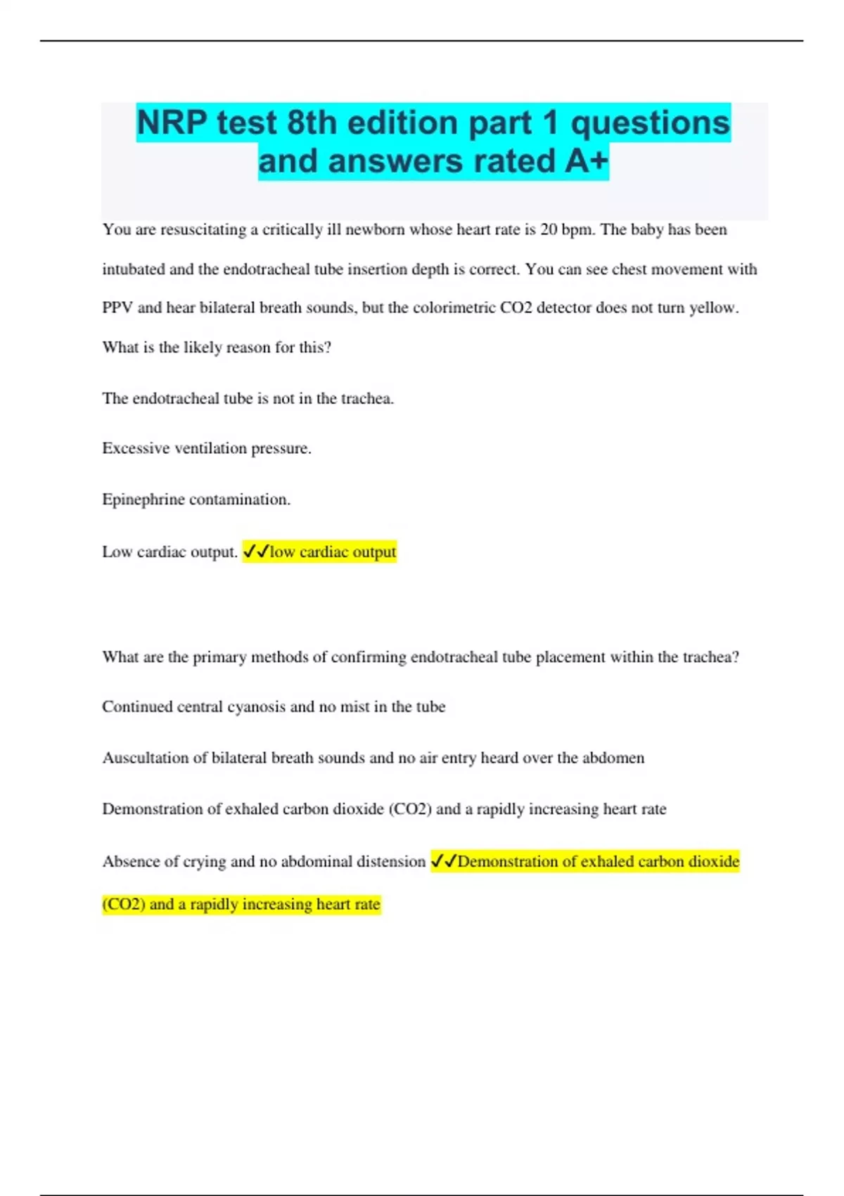 NRP test 8th edition part 1 questions and answers rated A+ You are resuscitating a critically ill newborn whose heart rate is 20 bpm. The baby has been intubated and the endotracheal tube insertion depth is correct. You can see chest movement with PPV and hear bilateral breath sounds, but the colorimetric CO2 detector does not turn yellow. What is the likely reason for this? The endotracheal tube is not in the trachea. Excessive ventilation pressure. Epinephrine contamination. Low cardiac output. low cardiac output What are the primary methods of confirming endotracheal tube placement within the trachea? Continued central cyanosis and no mist in the tube Auscultation of bilateral breath sounds and no air entry heard over the abdomen Demonstration of exhaled carbon dioxide (CO2) and a rapidly increasing heart rate Absence of crying and no abdominal distension Demonstration of exhaled carbon dioxide (CO2) and a rapidly increasing heart rate Your team has provided face-mask PPV with chest movement for 30 seconds. When is placement of an endotracheal tube strongly recommended? The baby's heart rate remains less than 100 bpm and is not increasing. The baby's heart rate is between 60 and 100 bpm and the heart rate is increasing. The baby's heart rate is >100 bpm and the baby is beginning to breathe. The baby's heart rate is >100 bpm and oxygen saturation is less than the target range. The baby's heart rate remains less than 100 bpm and is not increasing. During a delivery, when and where should a person with intubation skills be available? In the hospital and immediately available In the delivery room or operating room at every birth Available on call at home Available on call from a remote area of the hospital In the hospital and immediately available According to the Textbook of Neonatal Resuscitation, 8th edition algorithm, at what point during resuscitation is a cardiac monitor recommended to assess the baby's heart rate? After chest compressions are performed for at least 2 minutes When an alternative airway is inserted Immediately after epinephrine is administered Anytime pulse oximetry is used to assess oxygen saturation alternative airway What size laryngoscope blade is recommended to intubate a preterm newborn with an estimated gestational age of 32 weeks (estimated birth weight of 1.4 kg)? 2 1 0 00 0 Even brief interruptions of chest compressions may significantly reduce their effectiveness, but it is also important to assess the need to continue chest compressions. What is the preferred way to assess the heart rate during chest compressions? Briefly interrupt chest compressions every 30 seconds to auscultate the heart rate. Briefly interrupt chest compressions and palpate the brachial pulse. Briefly interrupt chest compressions every 60 seconds to assess the heart rate using the cardiac monitor. Briefly interrupt chest compressions to palpate the umbilical cord. Briefly interrupt chest compressions every 60 seconds to assess the heart rate using the cardiac monitor. Your team is resuscitating a newborn at birth. The heart rate is low and the baby has poor perfusion. Which is the preferred method to assess the heart rate? Cardiac monitor Pulse oximeter CO2 detector Direct auscultation Cardiac monitor When are chest compressions indicated? When the heart rate is less than 80 bpm When the heart rate remains less than 60 bpm after at least 30 seconds of PPV that moves the chest, preferably through an alternative airway When the heart rate remains less than 100 bpm after 30 seconds of PPV that moves the chest preferably through an alternative airway When the heart rate remains less than 100 bpm despite PPV with 100% oxygen When the heart rate remains less than 60 bpm after at least 30 seconds of PPV that moves the chest, preferably through an alternative airway After 60 seconds of PPV coordinated with chest compressions, the cardiac monitor indicates a heart rate of 70 beats per minute. What is your next action? Stop chest compressions and continue PPV. Continue chest compressions and continue PPV. Stop chest compressions and stop PPV. Administer epinephrine while continuing chest compressions and PPV with 100% oxygen. Stop chest compressions and continue PPV. What is the recommended depth of chest compressions? One-third of the anterior-posterior diameter of the chest One-fourth of the anterior-posterior diameter of the chest Half of the anterior-posterior diameter of the chest Two-thirds of the anterior-posterior diameter of the chest One-third of the anterior-posterior diameter of the chest During chest compressions, which of the following is correct? To coordinate compressions and ventilations, the compressor calls out Breathe-two-three; breathe-two-three.... The compression to ventilation ratio is 15 compressions:2 ventilations. Most babies who require chest compressions will also require volume expander. To coordinate compressions and ventilations, the compressor calls out one-and-two-and-three-and-breathe-and.... To coordinate compressions and ventilations, the compressor calls out one-and-two-and-three-and-breathe-and.... Your team is resuscitating a newborn whose heart rate remains less than 60 bpm despite effective PPV and 60 seconds of chest compressions. You have administered epinephrine intravenously. According to the Textbook of Neonatal Resuscitation, 8th edition, what volume of normal saline flush should you administer? 0.5 mL 1 mL 3 mL 5 mL 3 ml According to the Textbook of Neonatal Resuscitation, 8th edition, what is the suggested initial dose for IV epinephrine (0.1 mg/1 mL=1 mg/10 mL)? 0.02 mg/kg (equal to 0.2 mL/kg) 0.05 mg/kg (equal to 0.5 mL/kg 0.1 mg/kg (equal to 1.0 mL/kg) 0.3 mg/kg (equal to 3.0 mL/kg) 0.02 mg/kg (equal to 0.2 mL/kg) When is the administration of a volume expander indicated during newborn resuscitation? The baby's heart rate is not increasing and there are signs of shock or a history of acute blood loss. The baby's heart rate is increasing but t