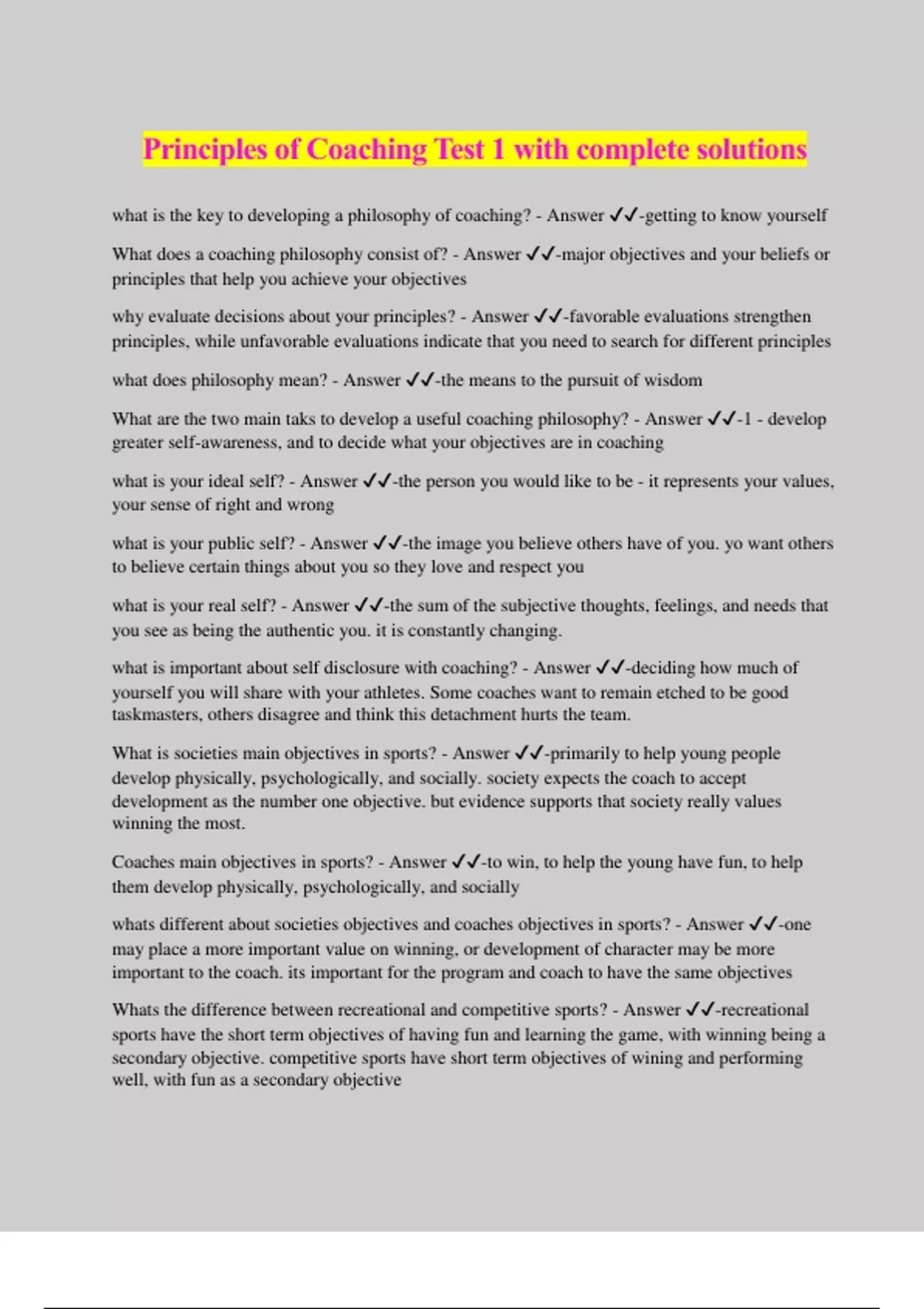 Principles of Coaching Test 1 with complete solutions what is the key to developing a philosophy of coaching? - Answer ️️ -getting to know yourself What does a coaching philosophy consist of? - Answer ️️ -major objectives and your beliefs or principles that help you achieve your objectives why evaluate decisions about your principles? - Answer ️️ -favorable evaluations strengthen principles, while unfavorable evaluations indicate that you need to search for different principles what does philosophy mean? - Answer ️️ -the means to the pursuit of wisdom What are the two main taks to develop a useful coaching philosophy? - Answer ️️ -1 - develop greater self-awareness, and to decide what your objectives are in coaching what is your ideal self? - Answer ️️ -the person you would like to be - it represents your values, your sense of right and wrong what is your public self? - Answer ️️ -the image you believe others have of you. yo want others to believe certain things about you so they love and respect you what is your real self? - Answer ️️ -the sum of the subjective thoughts, feelings, and needs that you see as being the authentic you. it is constantly changing. what is important about self disclosure with coaching? - Answer ️️ -deciding how much of yourself you will share with your athletes. Some coaches want to remain etched to be good taskmasters, others disagree and think this detachment hurts the team. What is societies main objectives in sports? - Answer ️️ -primarily to help young people develop physically, psychologically, and socially. society expects the coach to accept development as the number one objective. but evidence supports that society really values winning the most. Coaches main objectives in sports? - Answer ️️ -to win, to help the young have fun, to help them develop physically, psychologically, and socially whats different about societies objectives and coaches objectives in sports? - Answer ️️ -one may place a more important value on winning, or development of character may be more important to the coach. its important for the program and coach to have the same objectives Whats the difference between recreational and competitive sports? - Answer ️️ -recreational sports have the short term objectives of having fun and learning the game, with winning being a secondary objective. competitive sports have short term objectives of wining and performing well, with fun as a secondary objective