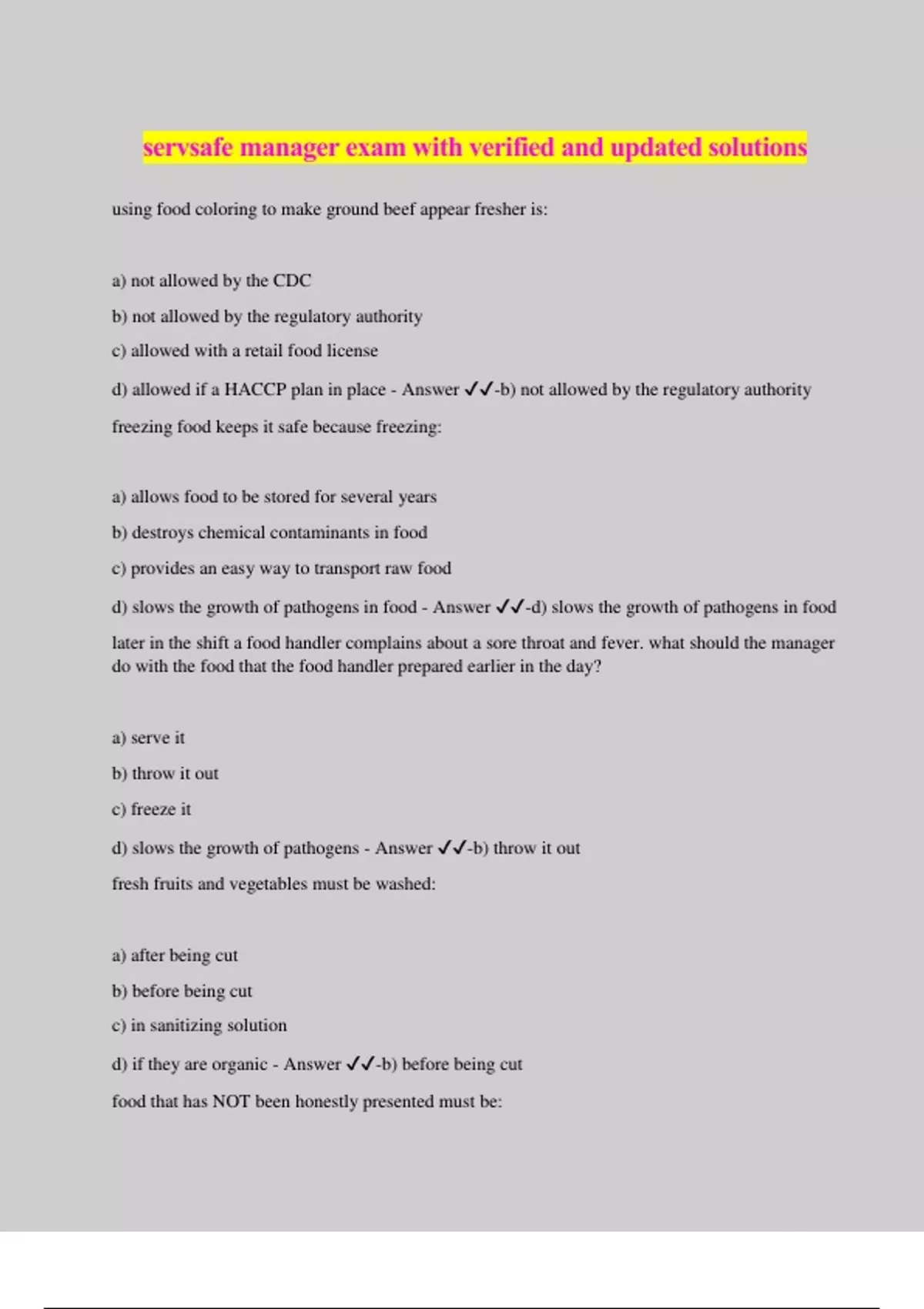 servsafe manager exam with verified and updated solutions using food coloring to make ground beef appear fresher is: a) not allowed by the CDC b) not allowed by the regulatory authority c) allowed with a retail food license d) allowed if a HACCP plan in place - Answer ️️ -b) not allowed by the regulatory authority freezing food keeps it safe because freezing: a) allows food to be stored for several years b) destroys chemical contaminants in food c) provides an easy way to transport raw food d) slows the growth of pathogens in food - Answer ️️ -d) slows the growth of pathogens in food later in the shift a food handler complains about a sore throat and fever. what should the manager do with the food that the food handler prepared earlier in the day? a) serve it b) throw it out c) freeze it d) slows the growth of pathogens - Answer ️️ -b) throw it out fresh fruits and vegetables must be washed: a) after being cut b) before being cut c) in sanitizing solution d) if they are organic - Answer ️️ -b) before being cut food that has NOT been honestly presented must be: a) thrown out b) re-labeled c) repurposed d) frozen - Answer ️️ -a) thrown out what agency is responsible for inspecting meat, poultry, egg, fruits and vegetables that are shipped across state lines? a) FDA b) USDA c) CDC d) NSF - Answer ️️ -b) USDA food handler may wear fingernail polish or artificial nails if they: a) wash hands frequently b) wear intact gloves in good repair c) clean and trim nails daily d) work with ready to eat food only - Answer ️️ -b) wear intact gloves in good repair tabletop foodservice equipment on legs should have a space between the base of the equipment and the tabletop of at least: a) 2 in b) 3 in c) 4 in d) 8 in - Answer ️️ -c) 4 in one of the major food allergens is: a) latex b) tomatoes c) soybeans d) corn oil - Answer ️️ -c) soybeans floor coving is used to: a) reduce sharp corners on hard-to-clean floors b) eliminate the risk of slips and falls c) increase the resiliency of hard surface flooring d) improve noise reduction capabilities - Answer ️️ -a) reduce sharp corners on hard-to-clean floors tuna salad in a cooler must be held at or below an internal temperature of a) 32ºF b) 41ºF c) 45ºF d) 70ºF - Answer ️️ -b) 41ºF which is a TCS food? a) packets of mayonnaise b) alfalfa sprouts c) canned tomatoes d) iced tea - Answer ️️ -b) alfalfa sprouts to which minimum internal temperature should gravy be reheated in a microwave? a) 70ºF b) 135ºF c) 165ºF d) 180ºF - Answer ️️ -c) 165ºF which is most likely to be contaminated with the virus that causes hepatitis a? a) cooked long grain rice b) garlic mashed potatoes c) rare cooked hamburger d) raw oysters on the half shell - Answer ️️ -d) raw oysters on the half shell game animals received for sale in an operation should be: a) purchased before being field dressed b) free from parasites such as fleas and ticks c) legally hunted while in season d) commercially raised for food - Answer ️️ -d) commercially raised for food ready-to-eat food should be thrown out if it has been: a) stored in the cooler for 3 days b) in the temperature danger zone for 2 hours c) hot-held at a temperature of 135ºF d) handled by sick food handlers who are later excluded - Answer ️️ -d) handled by sick food handlers who are later excl